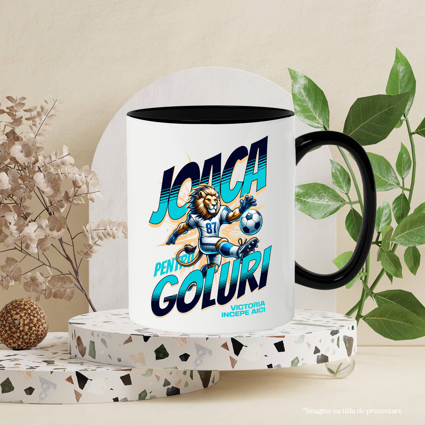Cana Personalizata cu Regele Leu Jucator De Fotbal uniforma Albastra Lovitura Minge Motivational, Ceramica, 330ML, cu Maner Negru