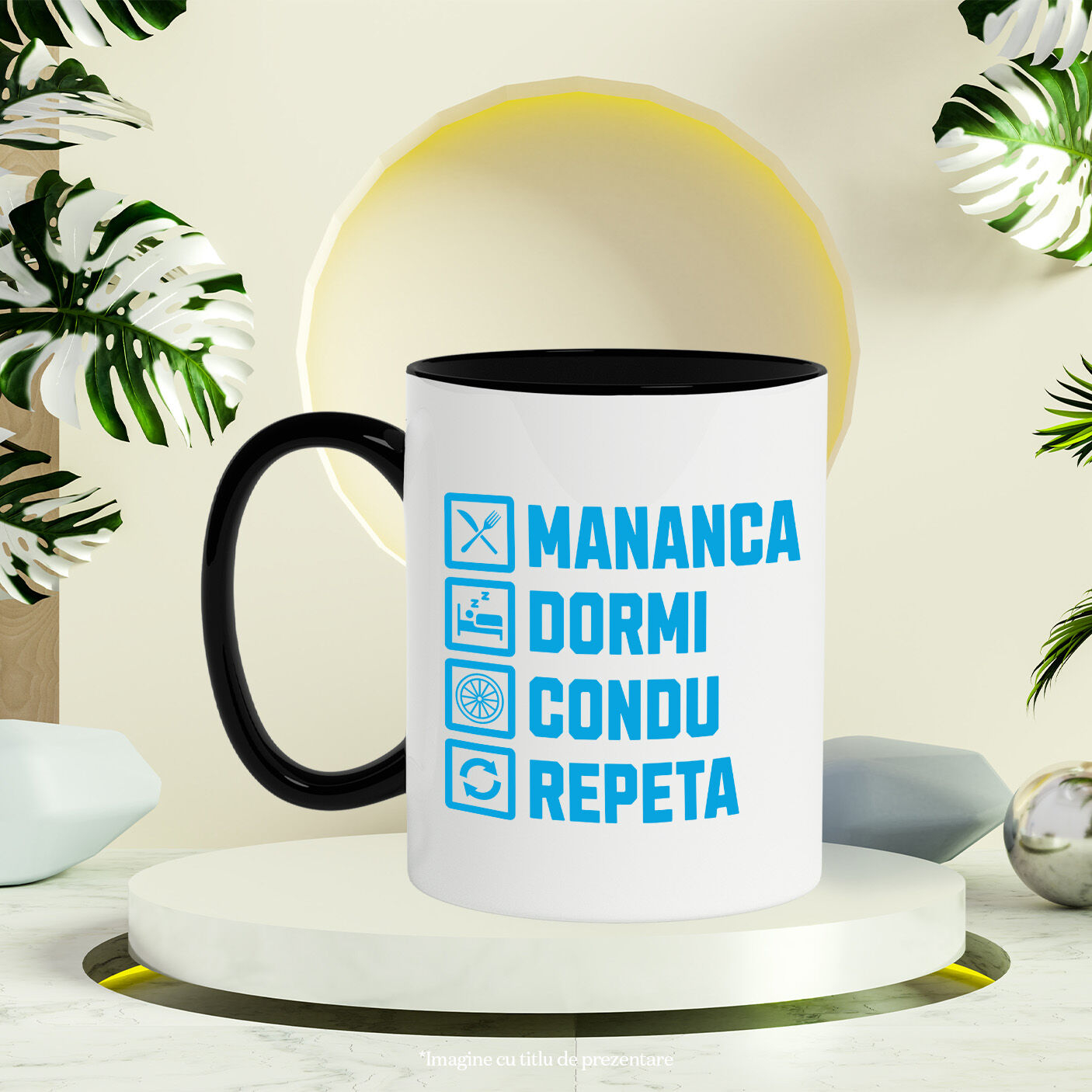 Cana Personalizata cu Rutina Zilnica Mesaj Haios Iubitorii De Masini Viteza, Ceramica, 330ML, cu Maner Negru