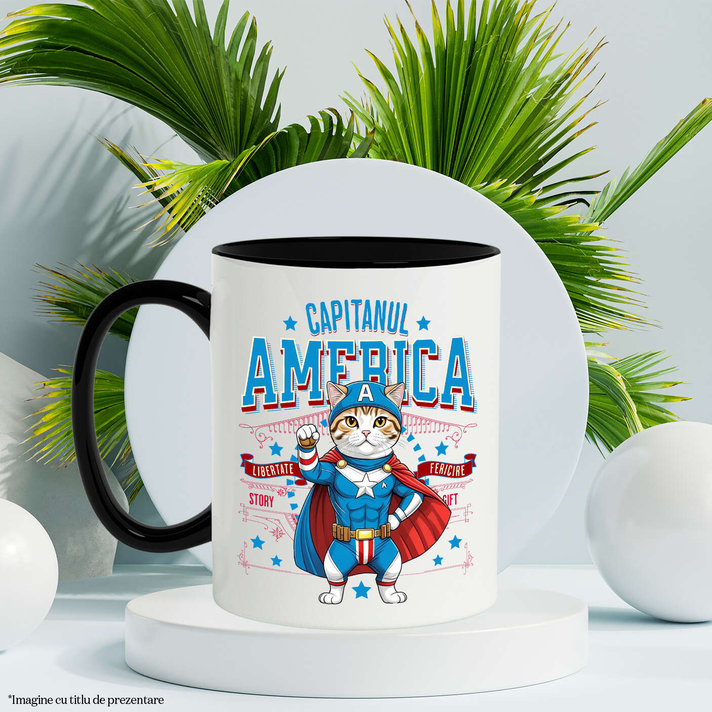 Cana Personalizata cu Scottish Fold Pisica In Costum de Capitan America cu Pelerina, Erou Nocturn, Desene animate, Copii, Iubitorii de Animale, Ceramica, 330ML, cu Maner Negru