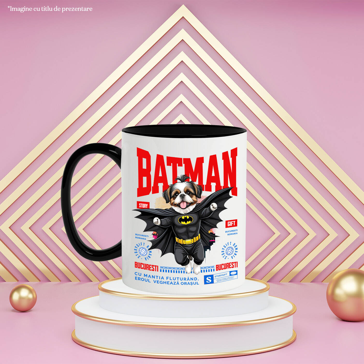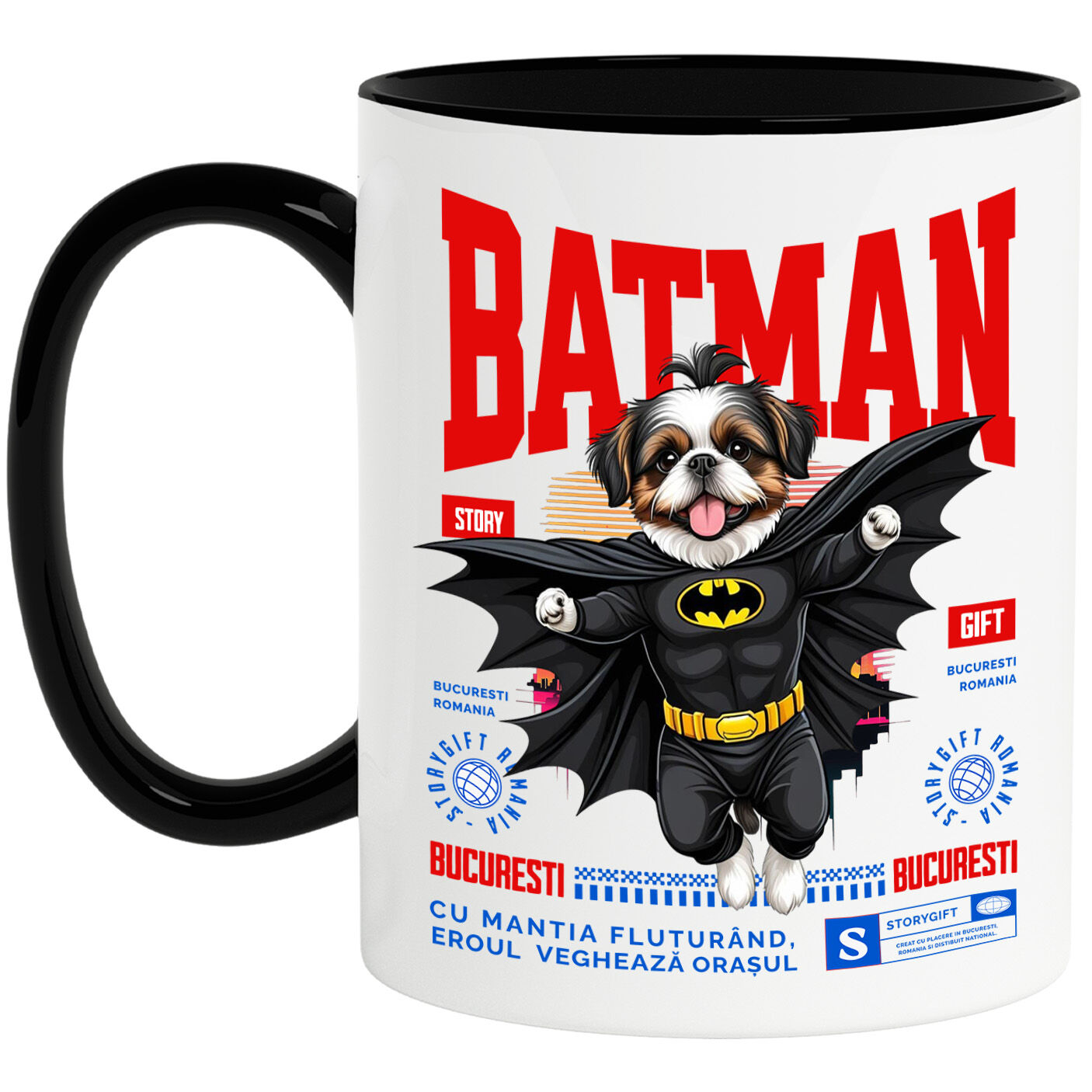 Cana Personalizata cu Shih Tzu Caine In Costum de BatMan cu Pelerina, Erou Nocturn, Desene animate, Copii, Iubitorii de Animale, Ceramica, 330ML, cu Maner Negru