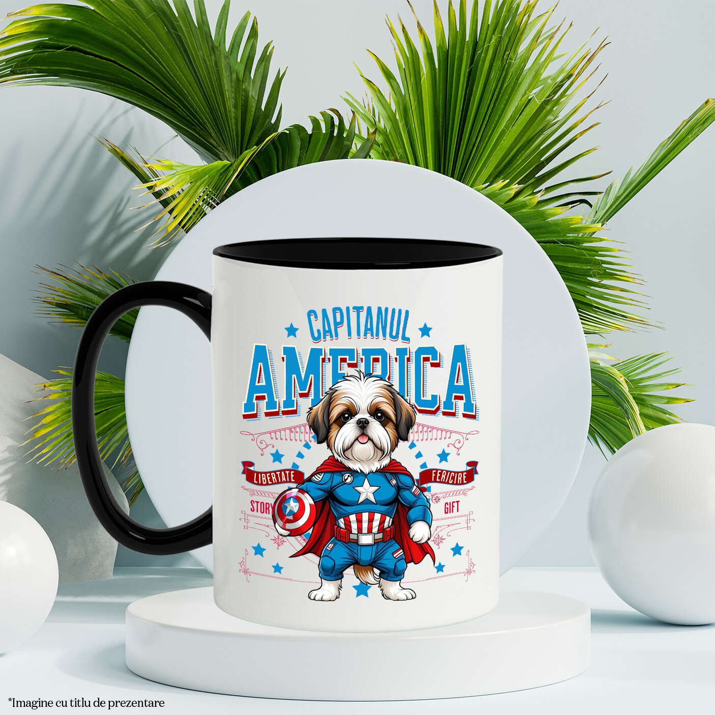 Cana Personalizata cu Shih Tzu Caine In Costum de Capitan America cu Pelerina, Erou Nocturn, Desene animate, Copii, Iubitorii de Animale, Ceramica, 330ML, cu Maner Negru