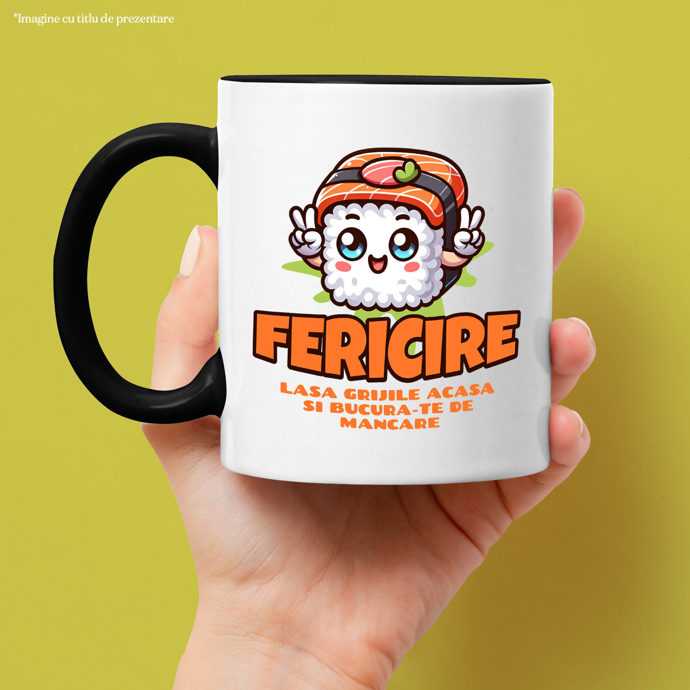 Cana Personalizata cu Sushi Vesel Cu Semnul Pace, Mancare Fast Food Mancare Asiatica, Ceramica, 330ML, cu Maner Negru