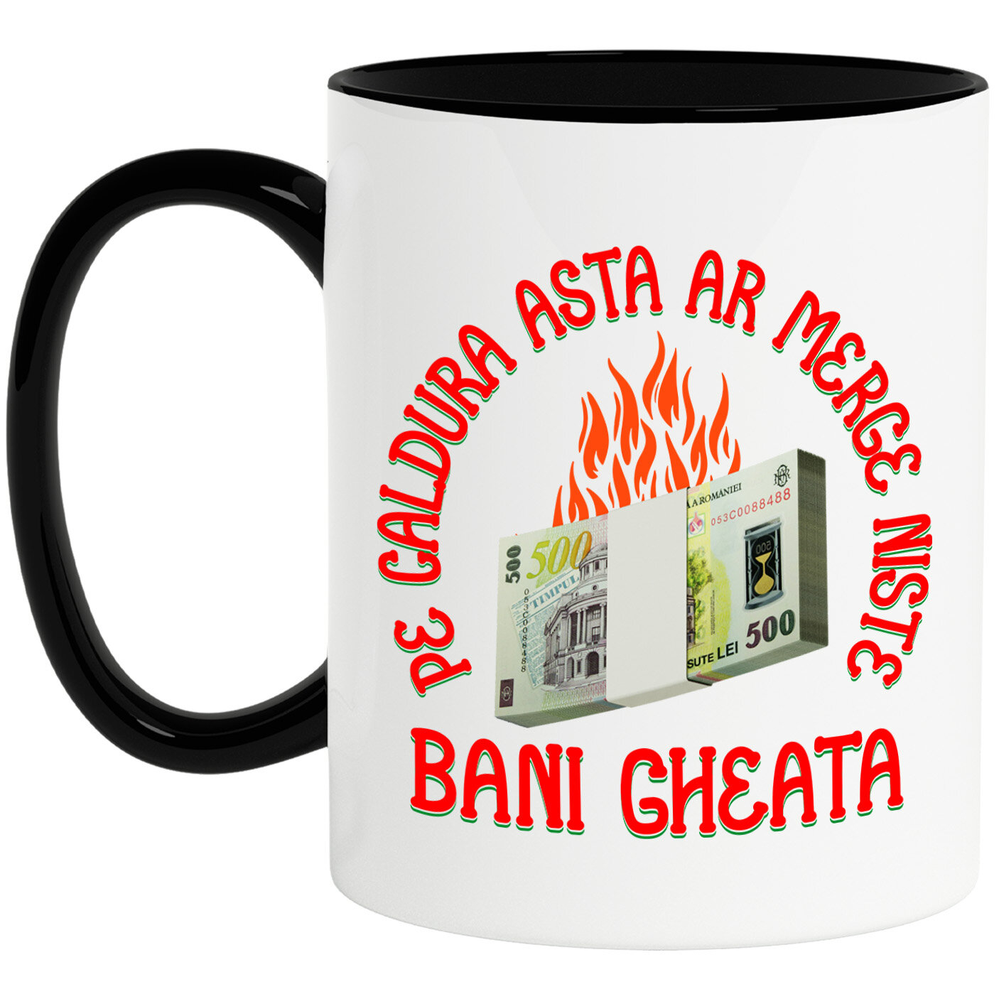 Cana Personalizata cu Teanc de Bancnote 500 Lei bani Zburatori In Flacari, Milionar, Avere, Financiar, Ceramica, 330ML, cu Maner Negru