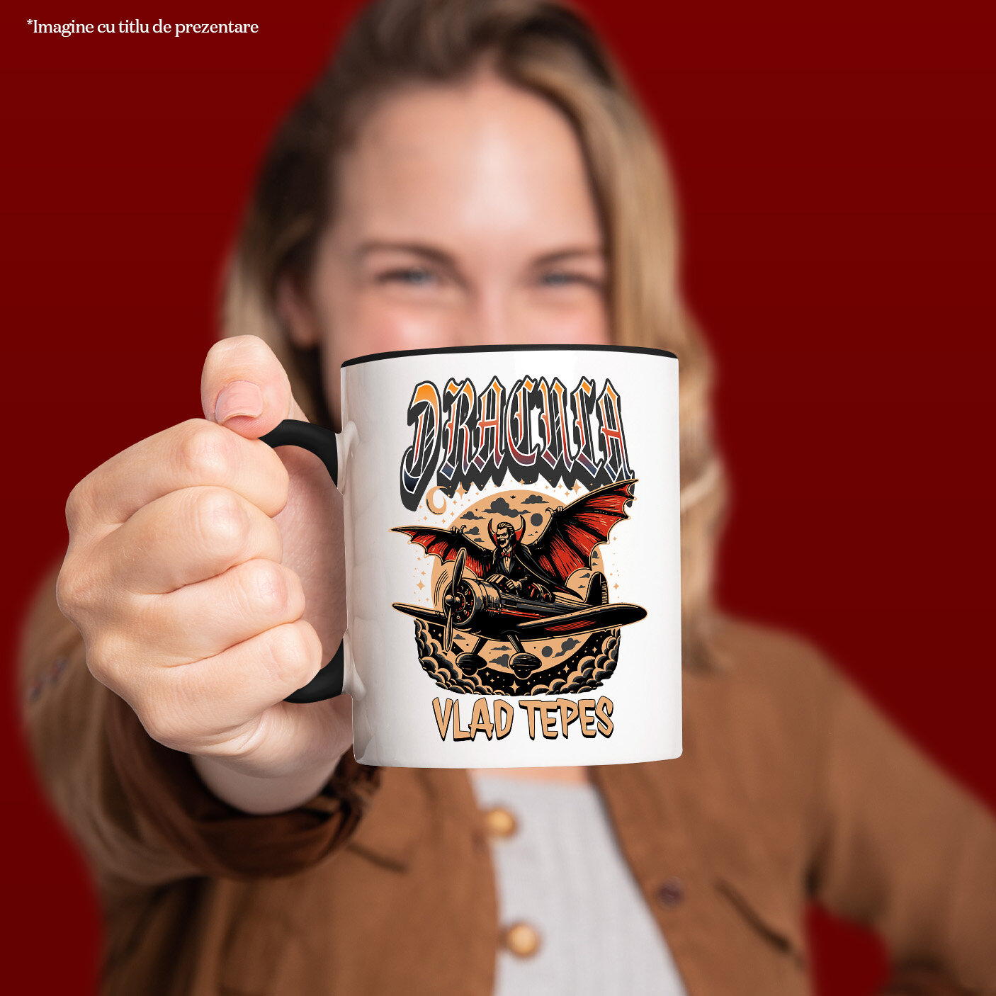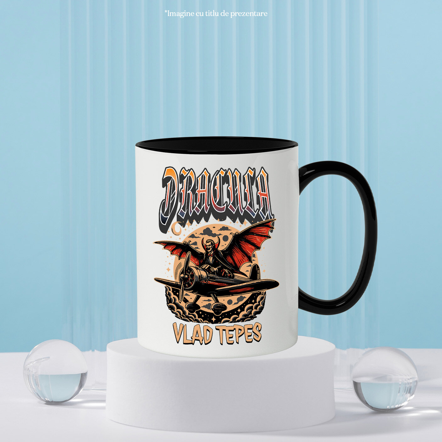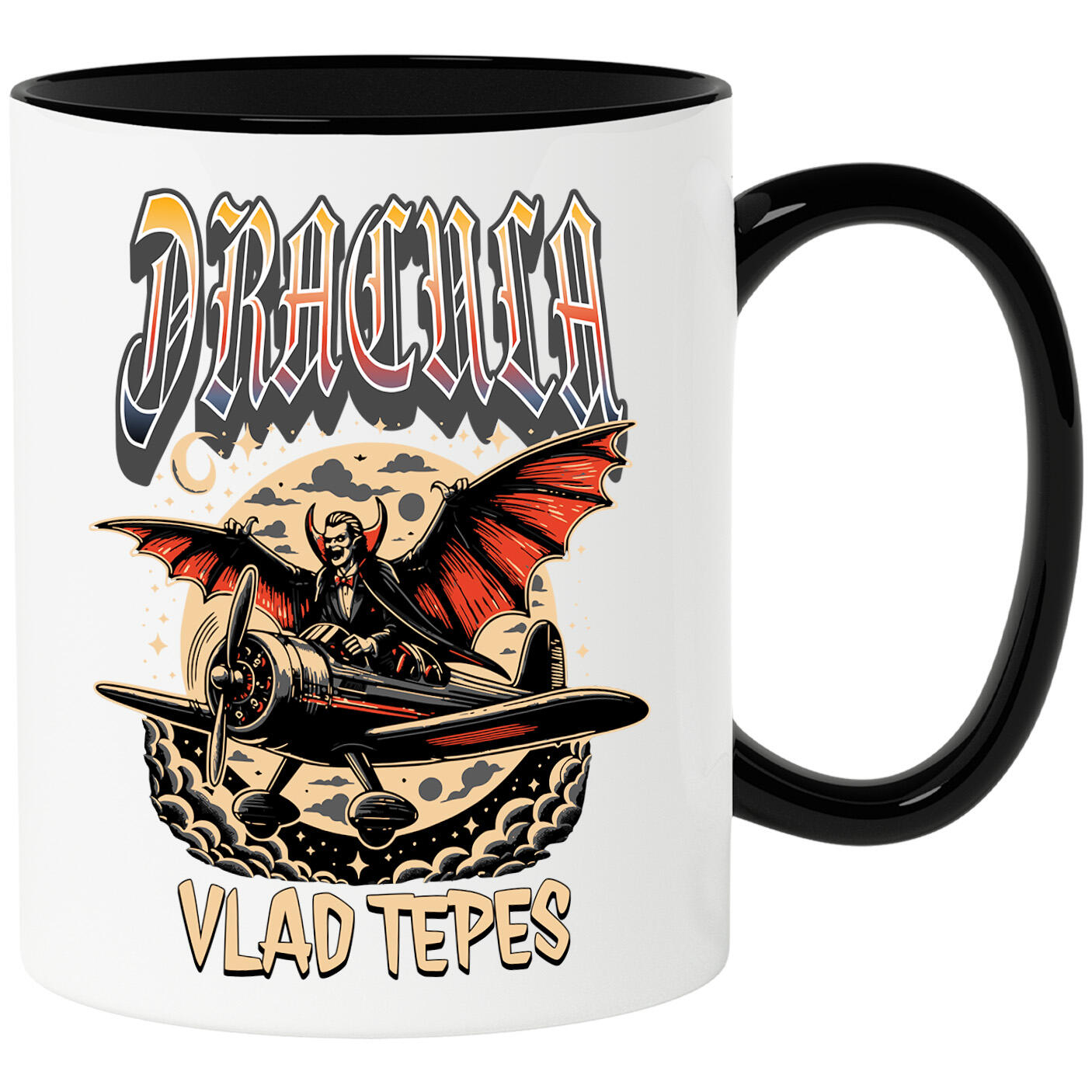 Cana Personalizata cu Vampir In Zbor Avion Luna Plina, Halowen, Text Vlad Tepes, Ceramica, 330ML, cu Maner Negru