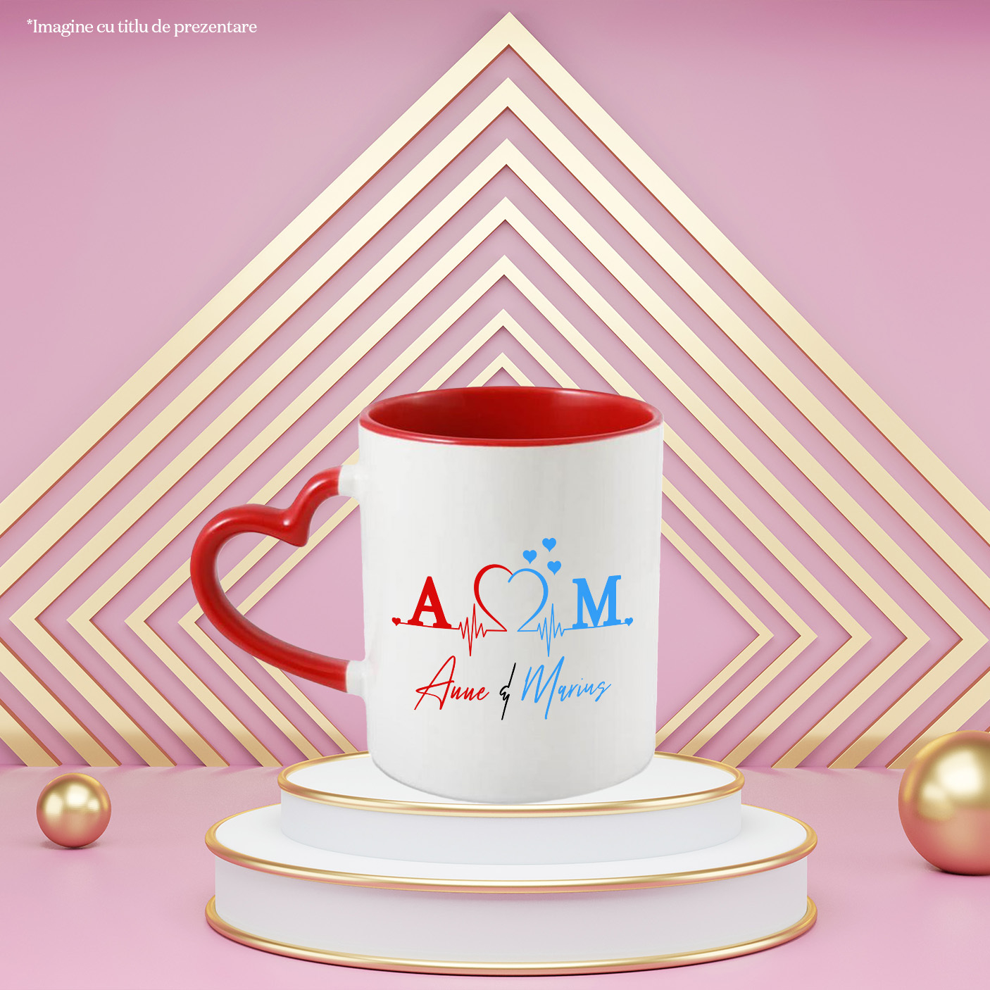 Cana Ritm Cardiac, valentine's day, text Nume Personalizat, Cuplu Indragostit, Cu Litera, 330ML, Ceramica, Cu Maner Inima Rosie si Interior Rosu