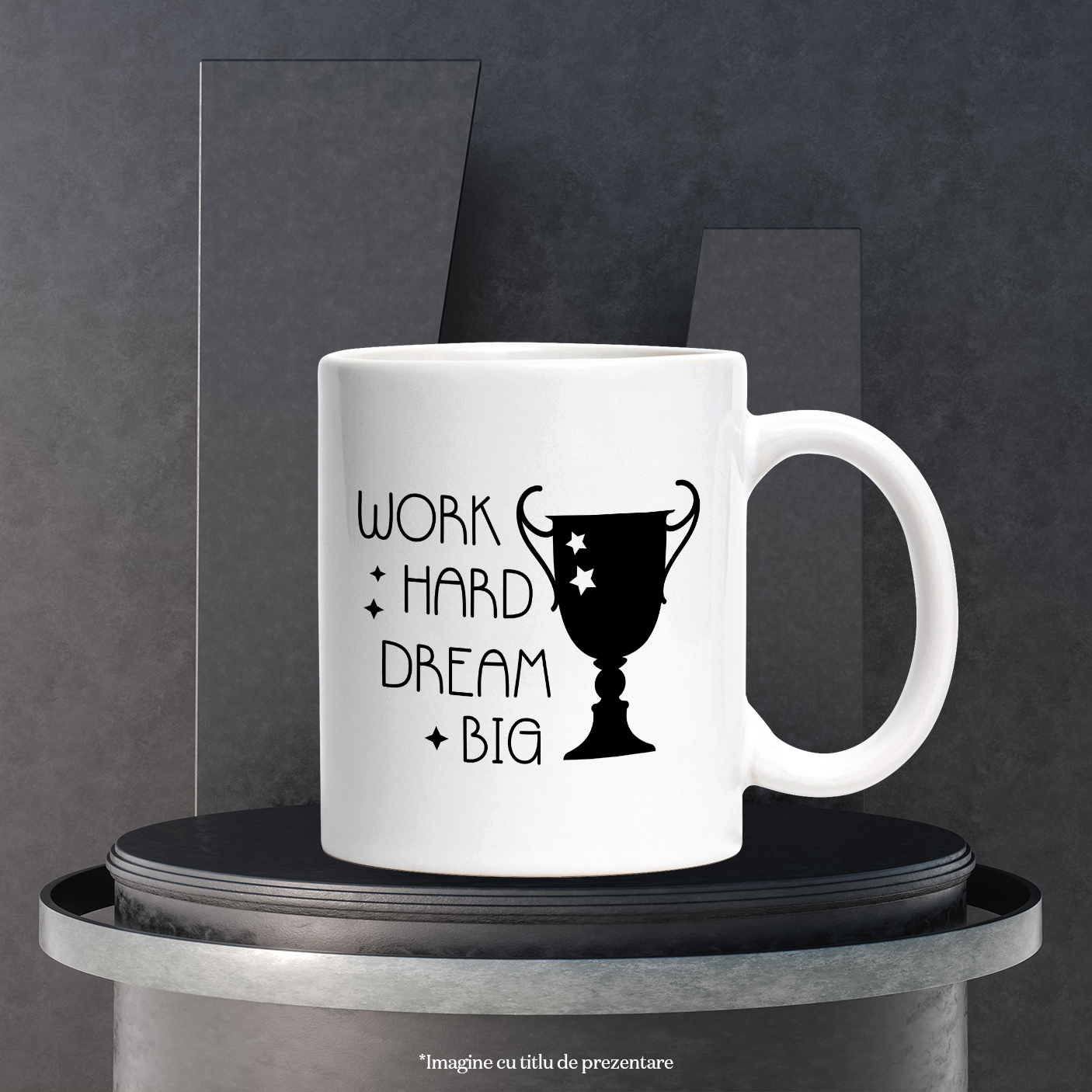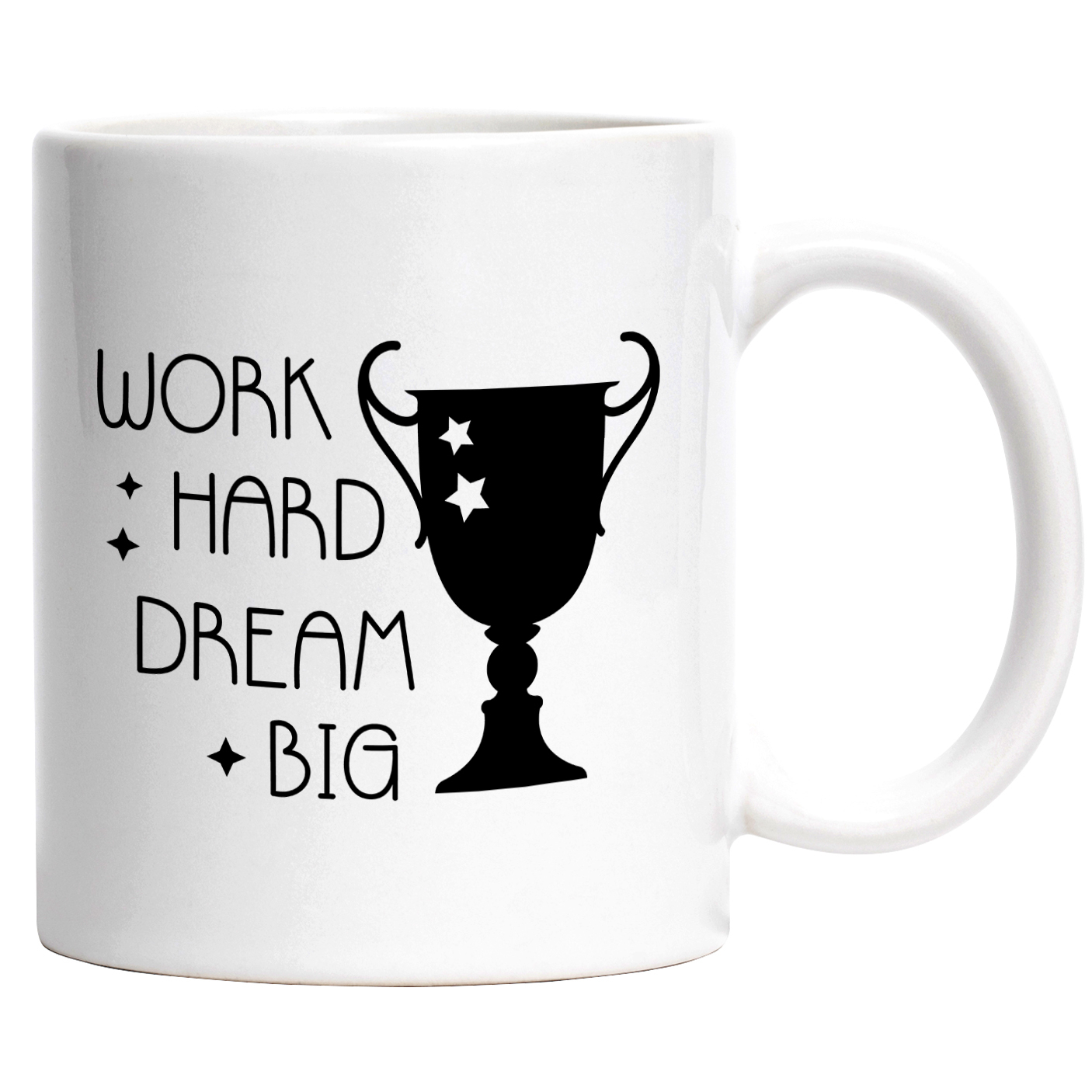 Cana Cu Mesaj In Engleza Work Hard Dream Big, Trofeu, Stele, Vis, Alb Negru 330 ml, Ceramica cu Maner Alb