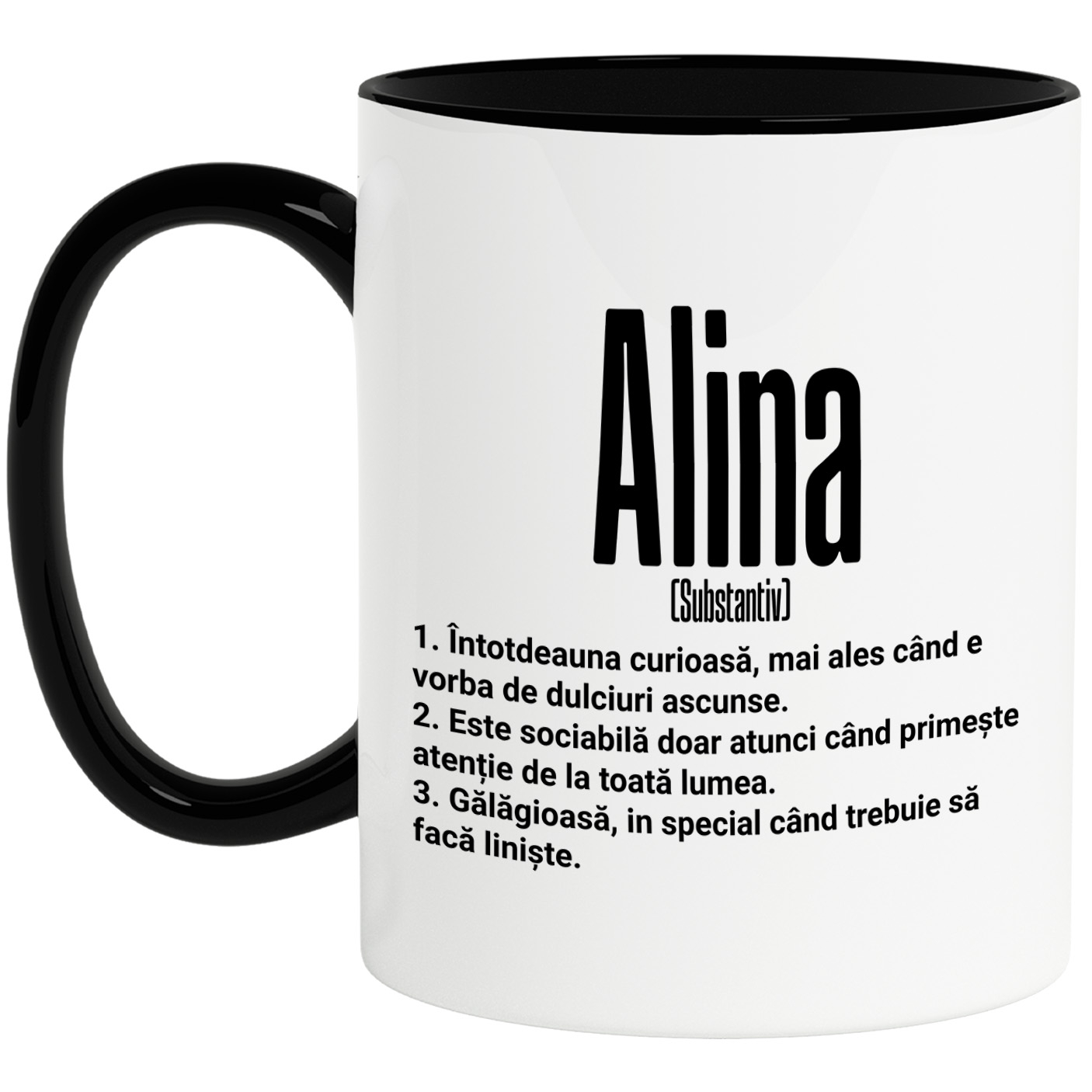 Cana Cu Numele Alina, si Mesaj Amuzant, Curioasa, Sociabila, Galagioasa, 330ml, Ceramica cu Maner Negru