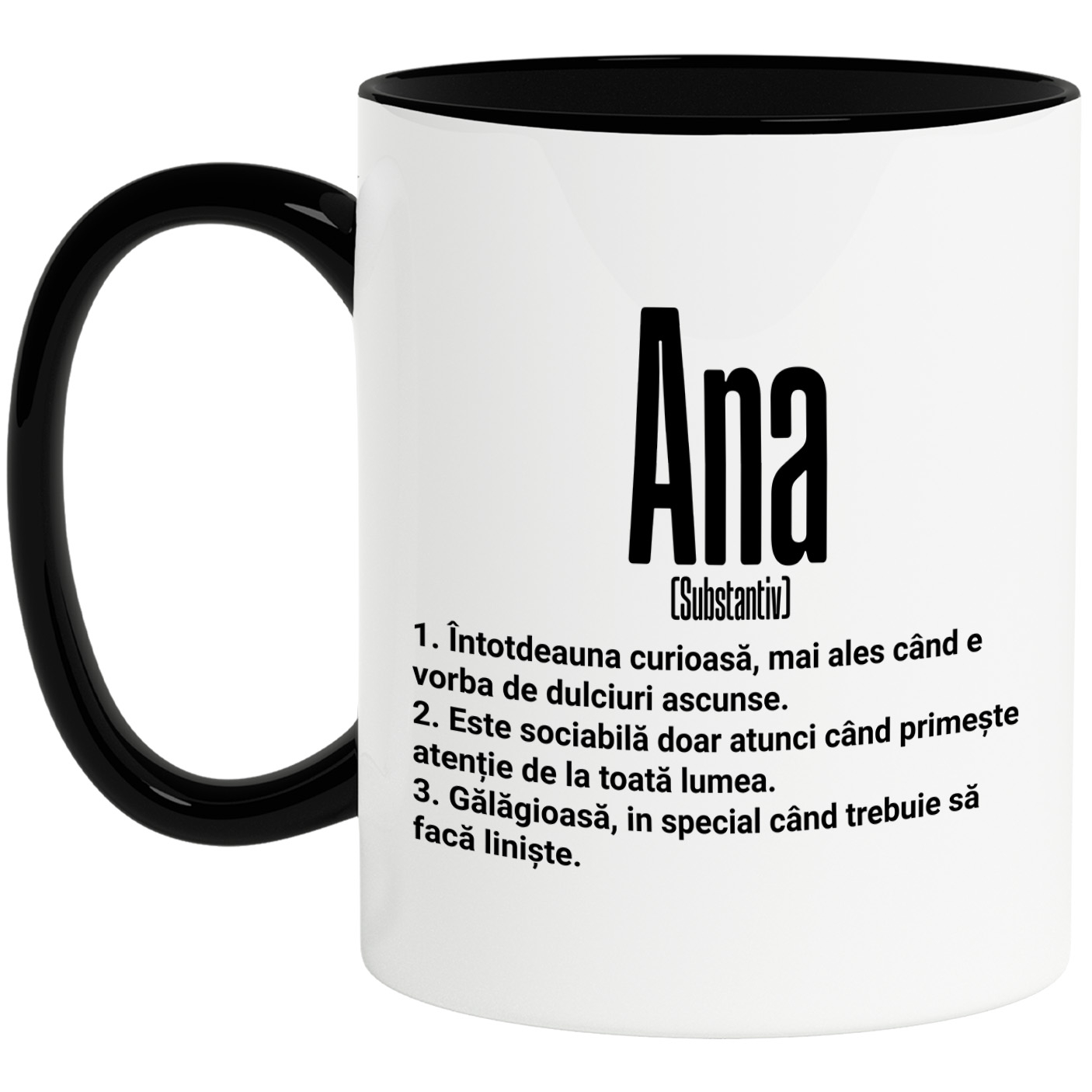 Cana Cu Numele Ana, si Mesaj Amuzant, Curioasa, Sociabila, Galagioasa, 330ml, Ceramica cu Maner Negru