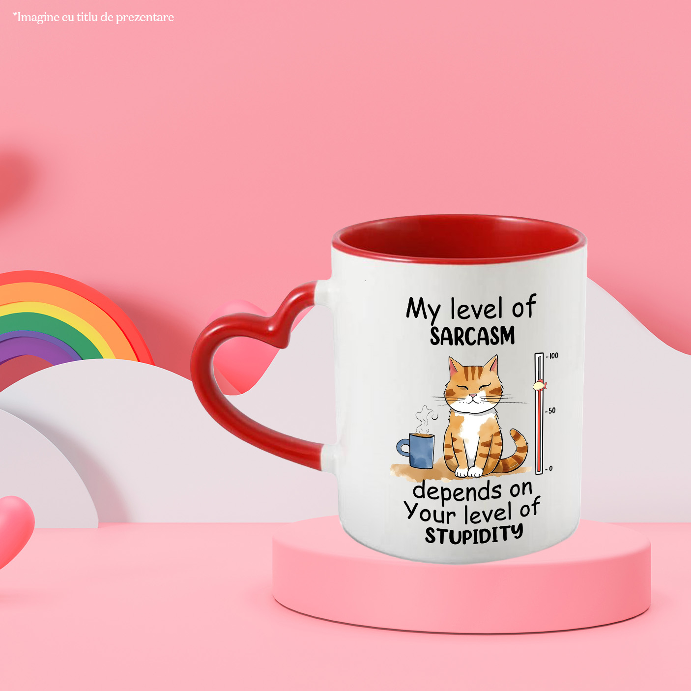 Cana cu pisica cu mesajul ""My level of sarcasm depends on your level of stupidity"", ilustratie, nivel, depinde, cafea cu Maner Inima Rosie