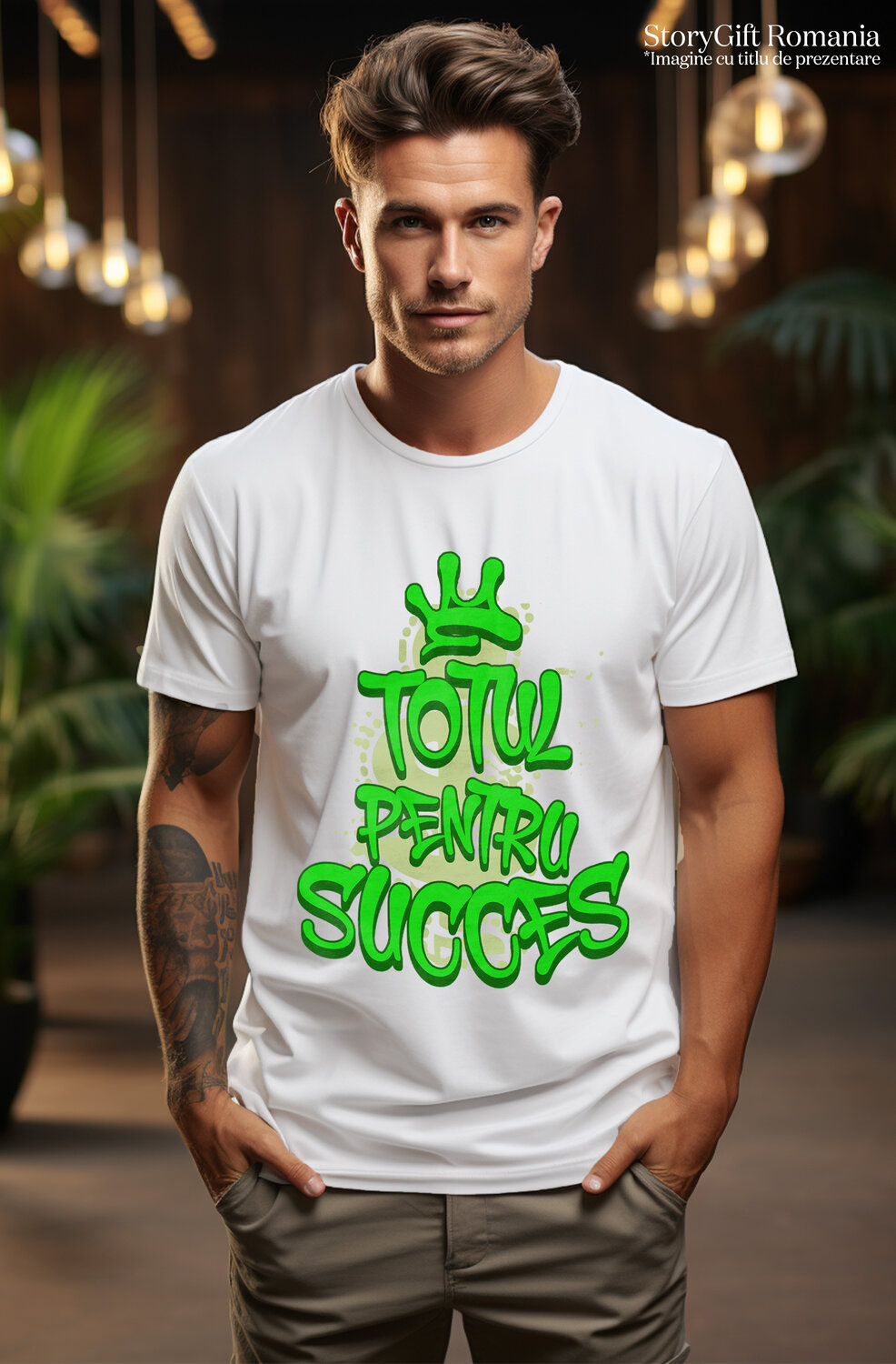 Tricou Barbati cu Citat Motivational Cu Simbol Dolar Coroana Totul Pentru Succes cu imprimeu pe Fata, 100% Bumbac, Alb, M