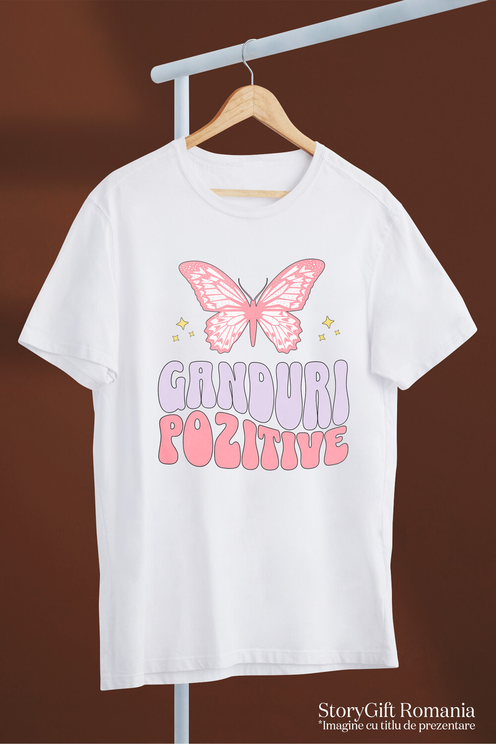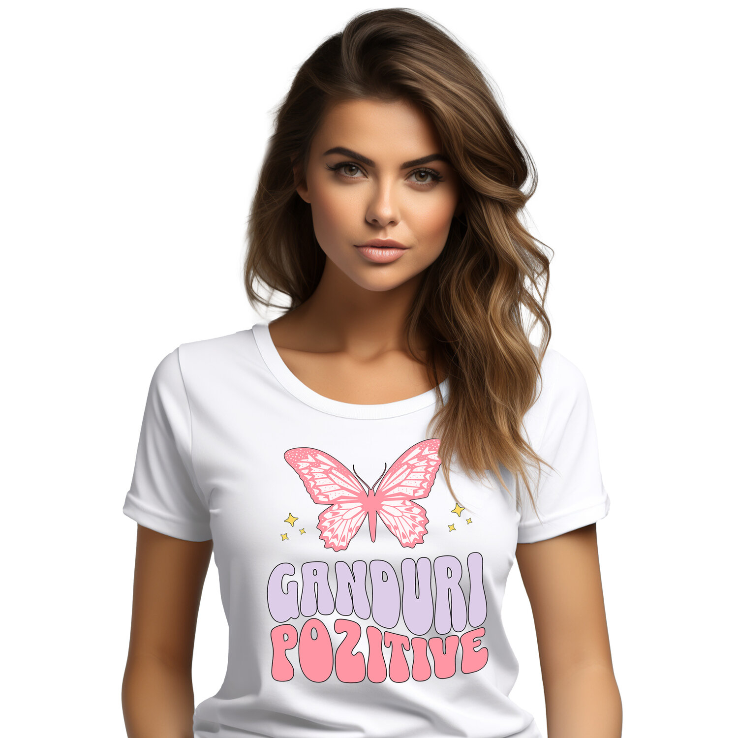 Tricou Femei cu Mesaj Inspirational Ganduri Pozitive Fluture roz cu imprimeu pe Fata, 100% Bumbac, Alb, XS