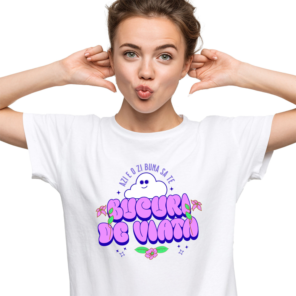 Tricou Femei cu Norisor Pufos Fericit Mesaj inspirational Bucura-te De Viata cu imprimeu pe Fata, 100% Bumbac, Alb, XS