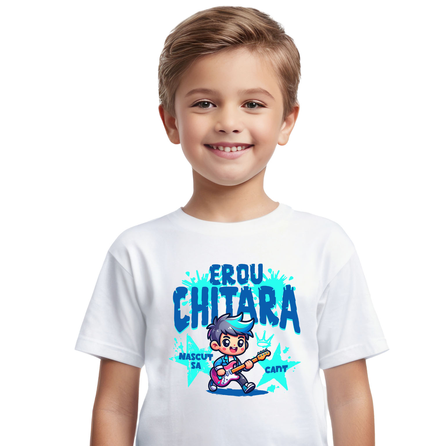 Tricou Copii cu Baiat Rockstar Cu Chitara Rosie pe Scena, Muzica, Distractie Petrecere cu imprimeu pe Fata, 100% Bumbac, Alb, 8 Ani