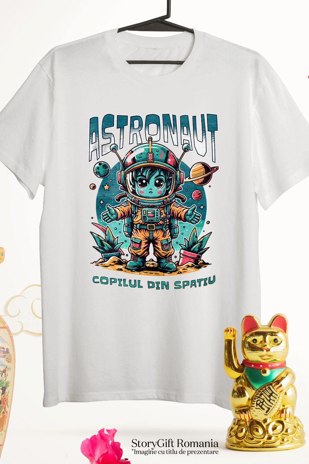 Tricou Copii cu Copil In Costum De astronaut Din Vechituri Vintige In Spatiu, Plante Verzi, Desene Animate cu imprimeu pe Fata, 100% Bumbac, Alb, 8 Ani