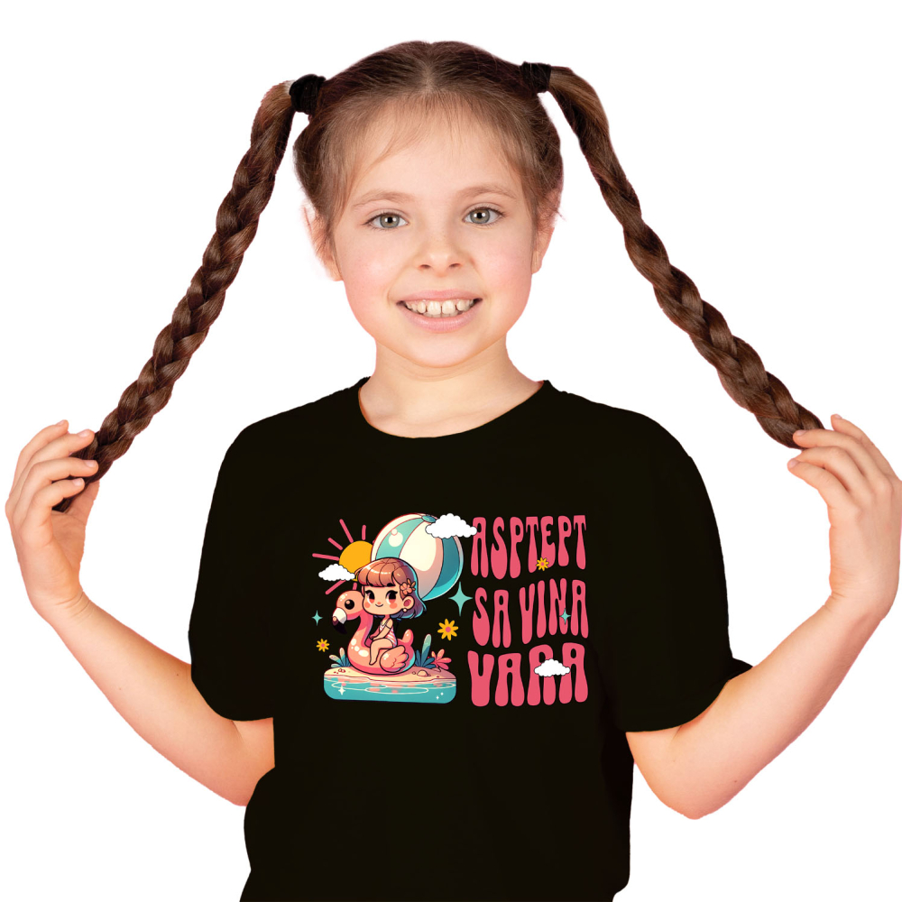 Tricou Copii cu Fata Pe Colac Flamingo in Mare Plaja, Relaxare, Balon, cu imprimeu pe Fata, 100% Bumbac, Negru, 10 Ani