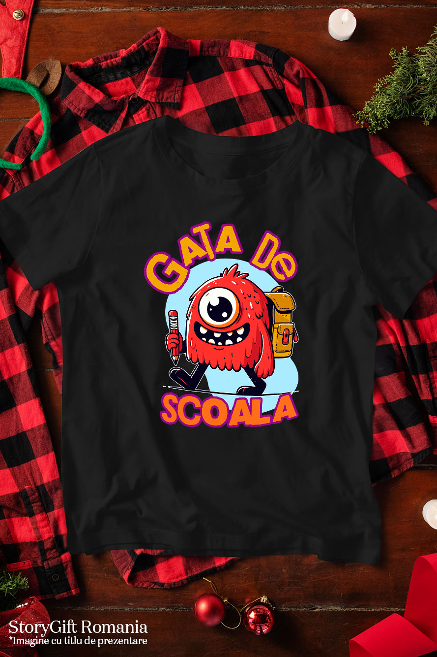 Tricou Copii cu Monstru Vesel Cu Blana Rosi, Scoala, Copii, Educatie, Desene Animate cu imprimeu pe Fata, 100% Bumbac, Negru, 12 Ani