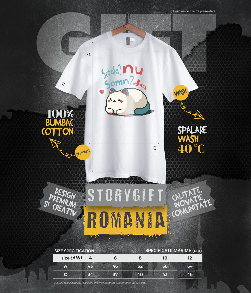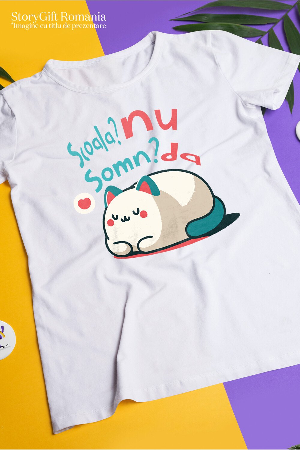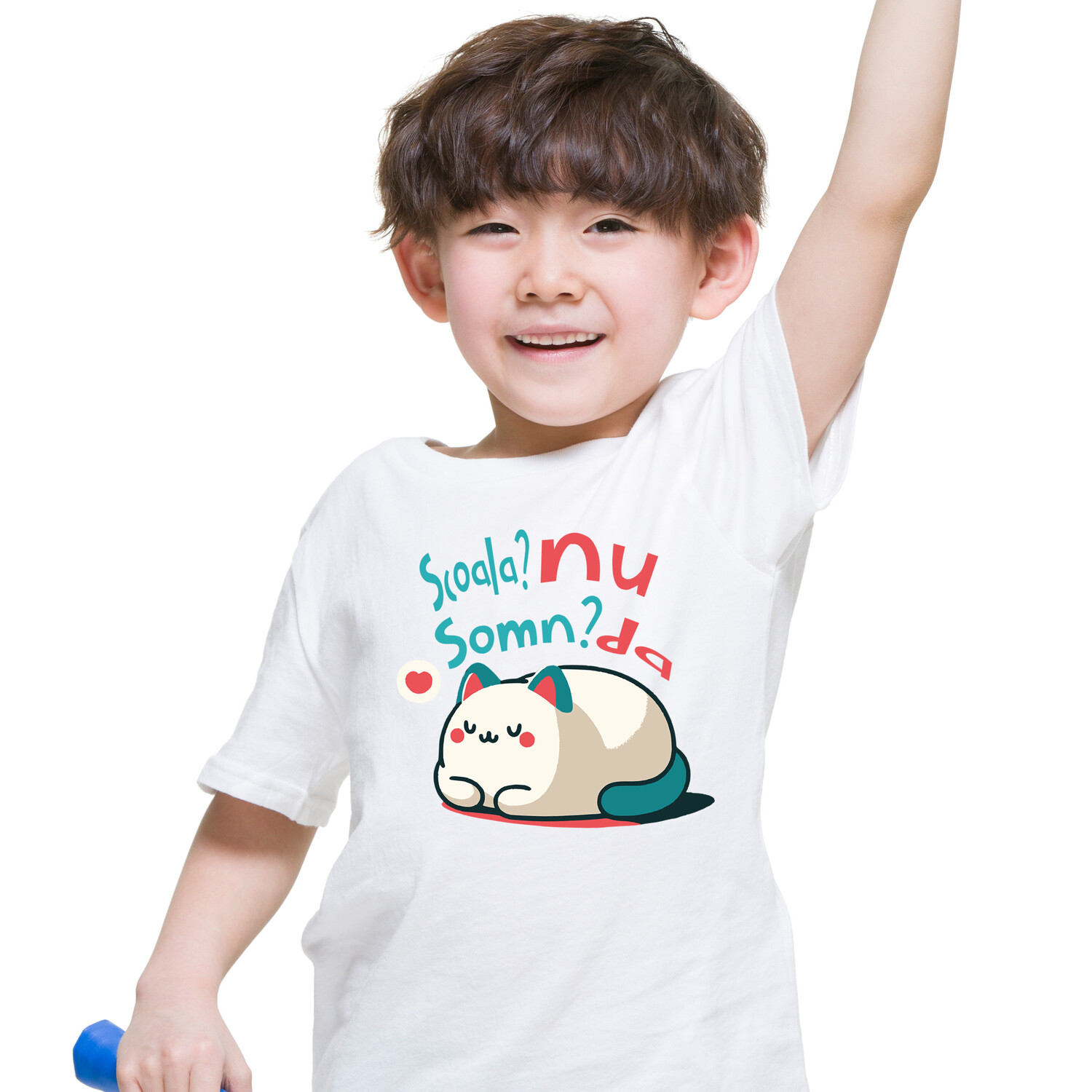 Tricou Copii cu Pisica Pufoasa, Dormind, Relaxare, Dimineata grea, Copii, Animal Blanos cu imprimeu pe Fata, 100% Bumbac, Alb, 6 Ani