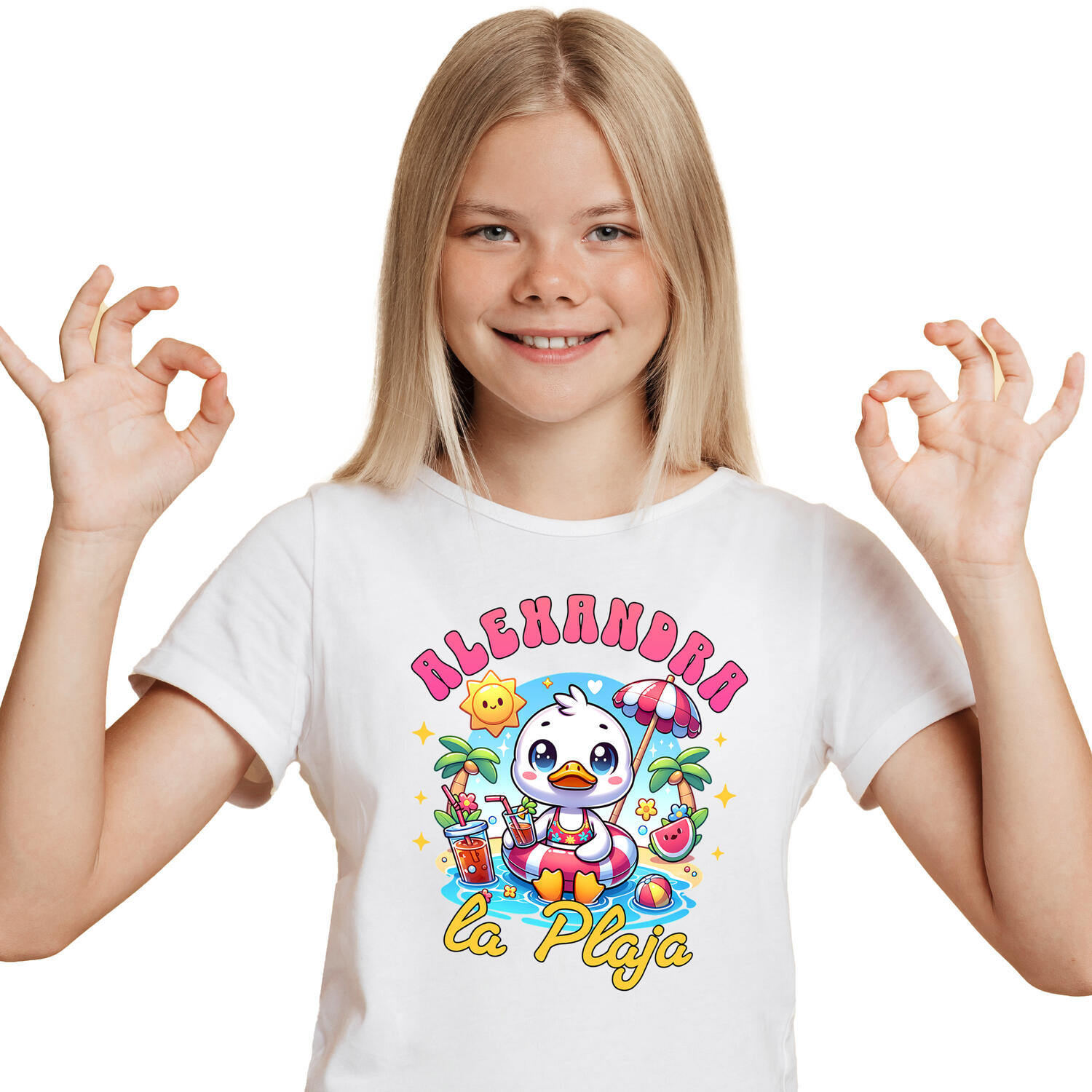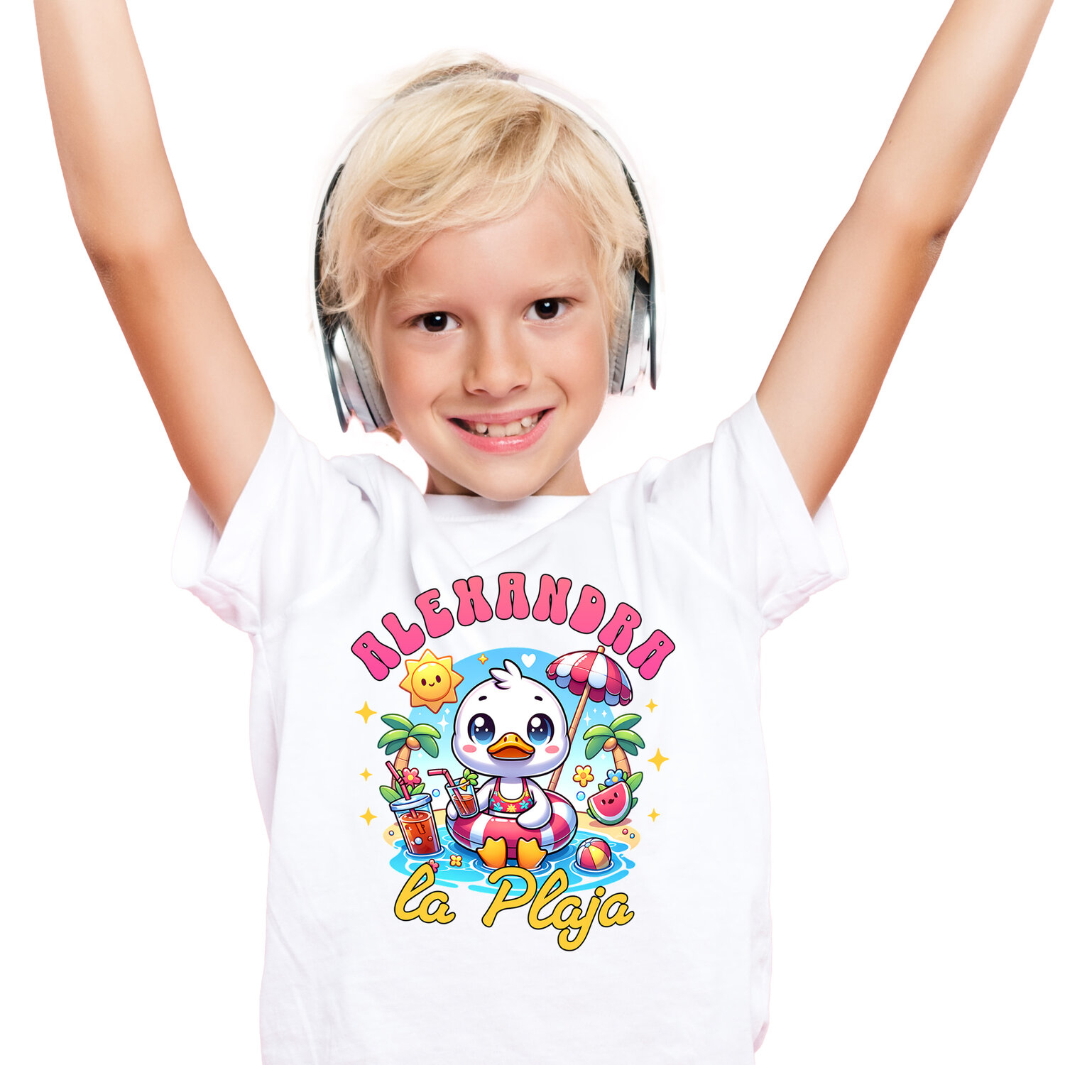 Tricou Copii cu Ratusca Alba Cu Colac Si Cocktail la Plaja, Vacanta, Relaxare, cu imprimeu pe Fata, 100% Bumbac, Alb, 12 Ani