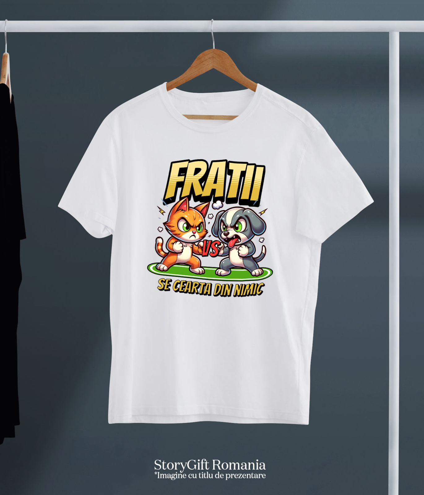 Tricou Copii cu Razboi Pisica Si Caine, Fratii, Lupta, Cearta, Animale Blanoase cu imprimeu pe Fata, 100% Bumbac, Alb, 8 Ani