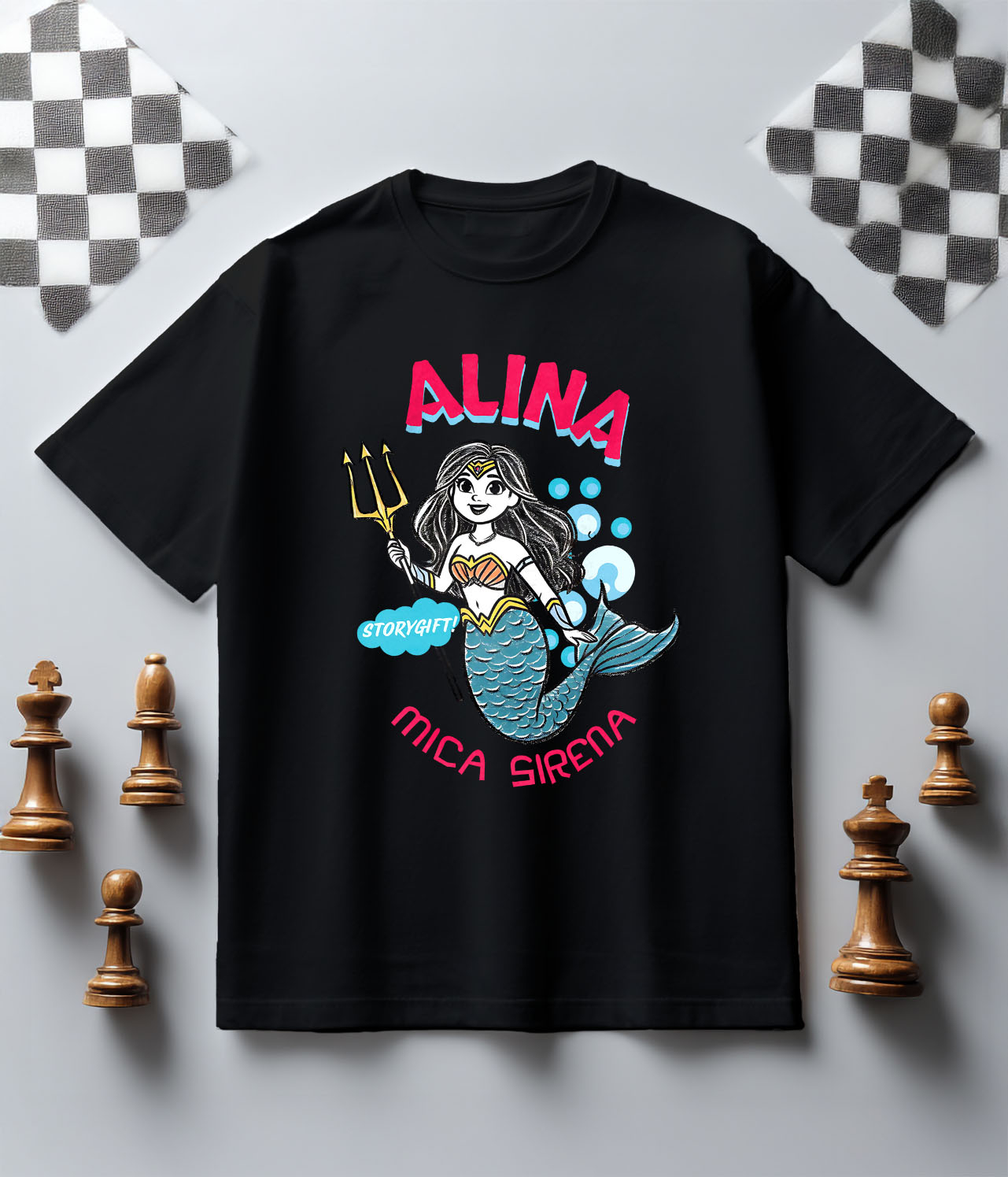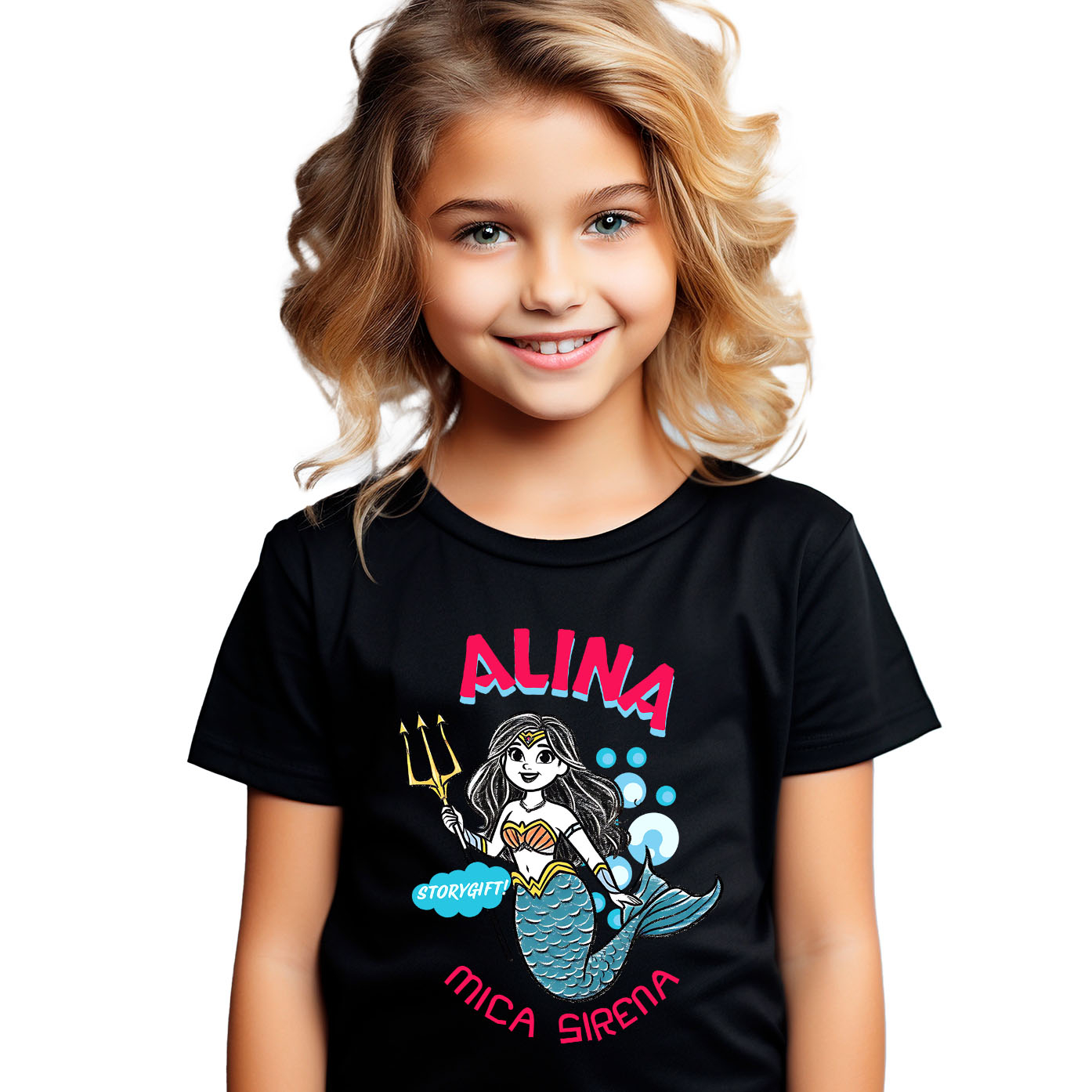 Tricou Copii cu Sirena De Mare Regina Cu Trident, Desene Animate, Lumea Basmelor cu imprimeu pe Fata, 100% Bumbac, Negru, 10 Ani