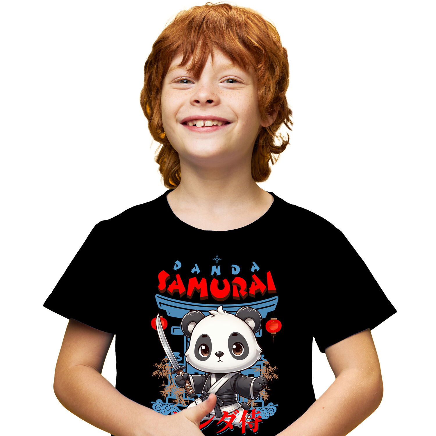 Tricou Copii cu Urs anda Animal Ninja Cultura Asiatica, Panda Samurai, Arte Martiale cu imprimeu pe Fata, 100% Bumbac, Negru, 8 Ani