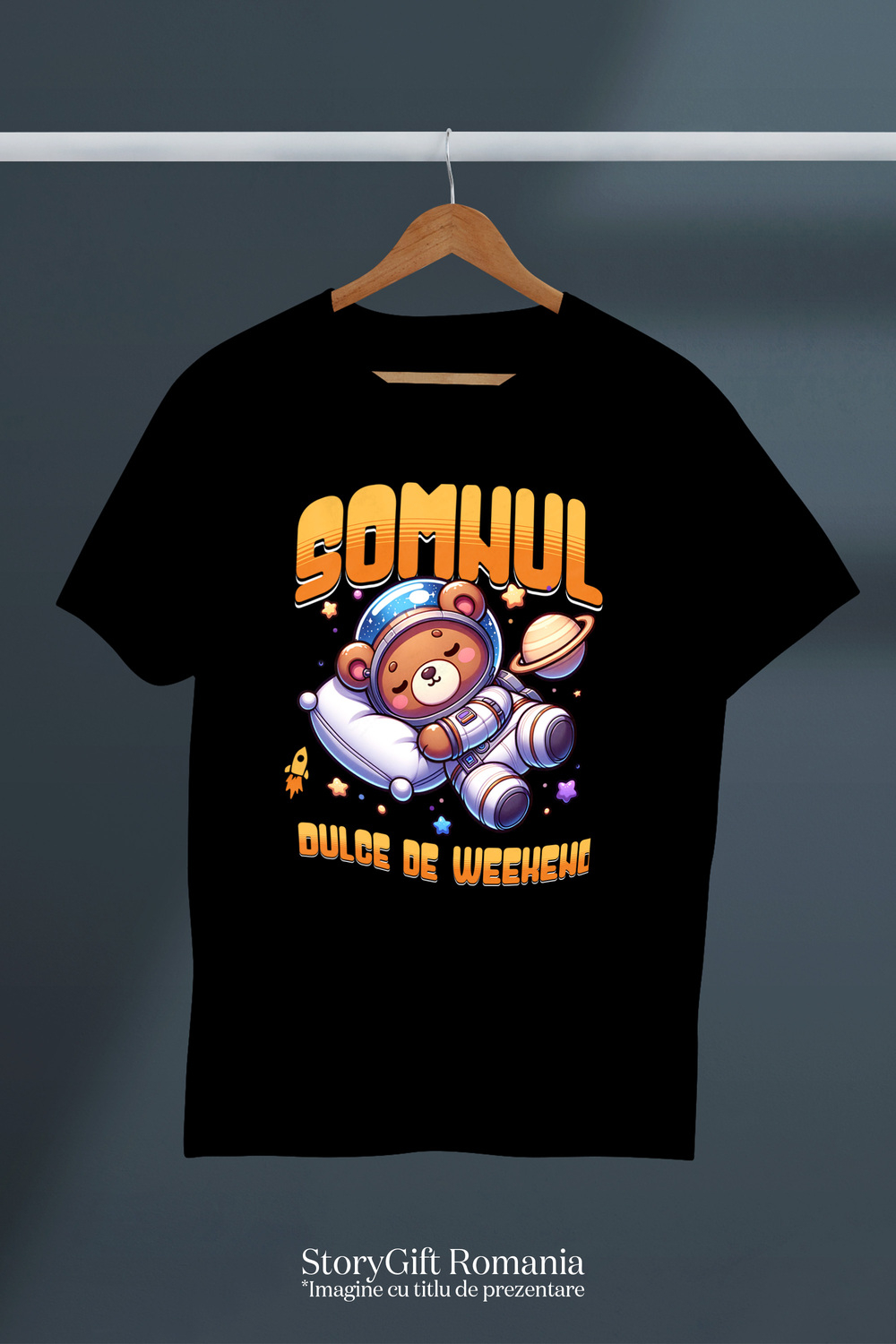 Tricou Copii cu Urs De Plus Maro,Somnul Dulce De Weekend In spatiu Printre Stele, Astronaut cu imprimeu pe Fata, 100% Bumbac, Negru, 10 Ani