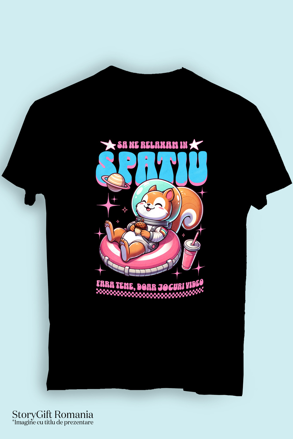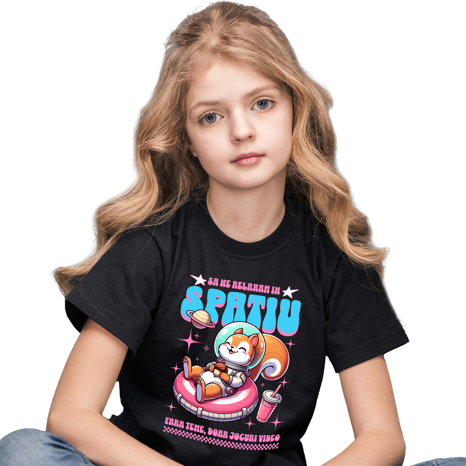 Tricou Copii cu Veverita In costum Spatial Pe Gogoasa Roz, Suc, Desene Animte, Astronomie cu imprimeu pe Fata, 100% Bumbac, Negru, 12 Ani