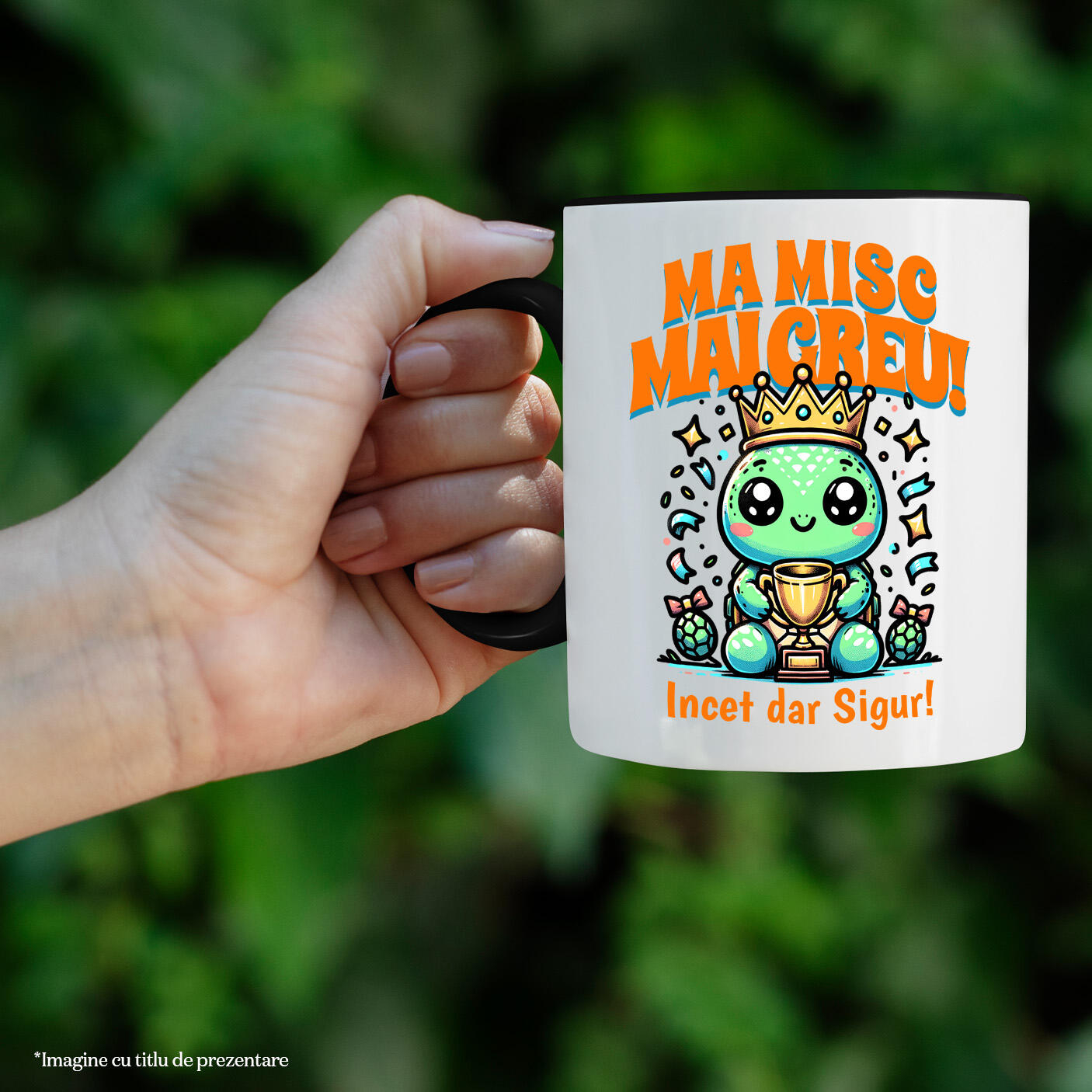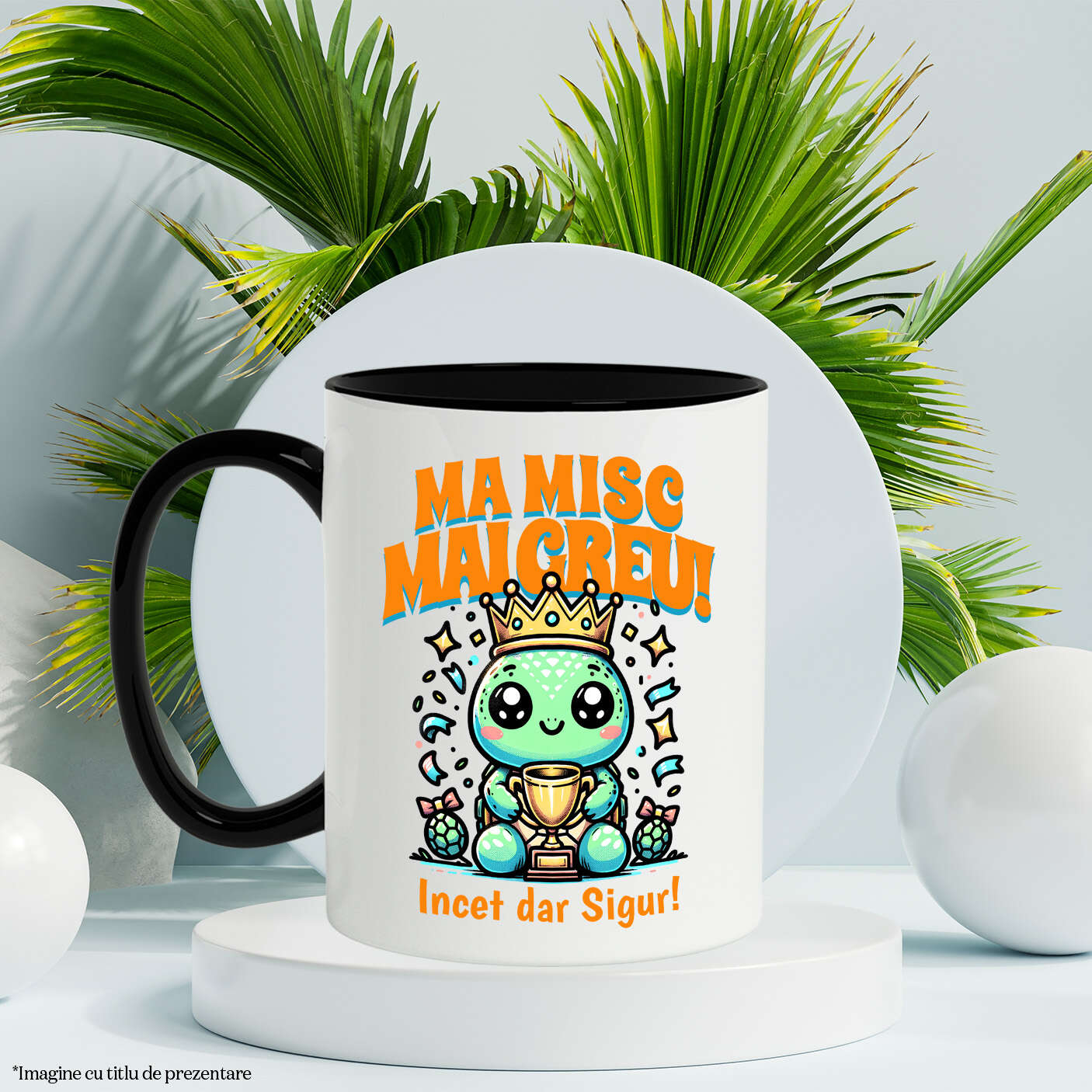 Cana Personalizata cu Broasca Testoasa Cu Coroana Regeasca Si trofeu, Castigator, desene Animate, Ceramica, 330ML, cu Maner Negru