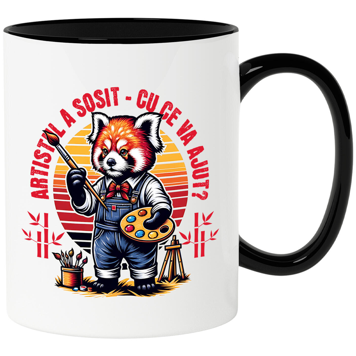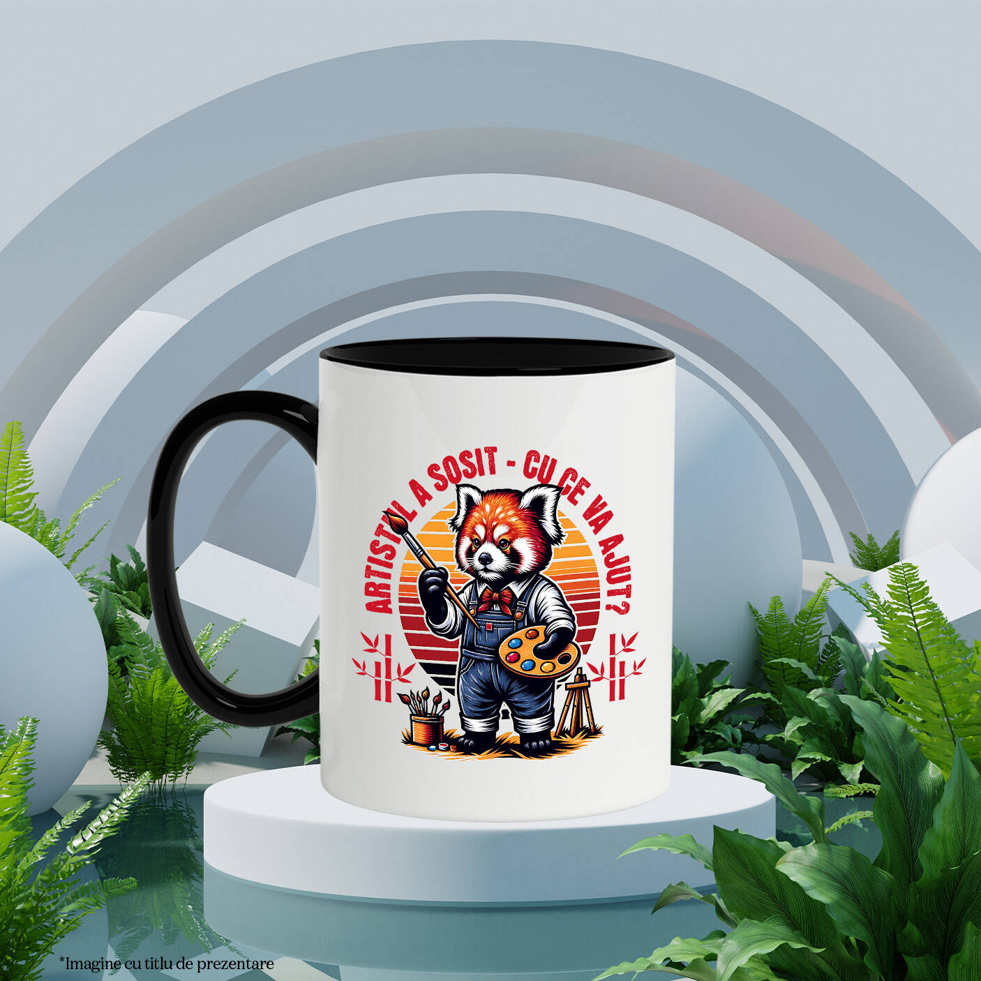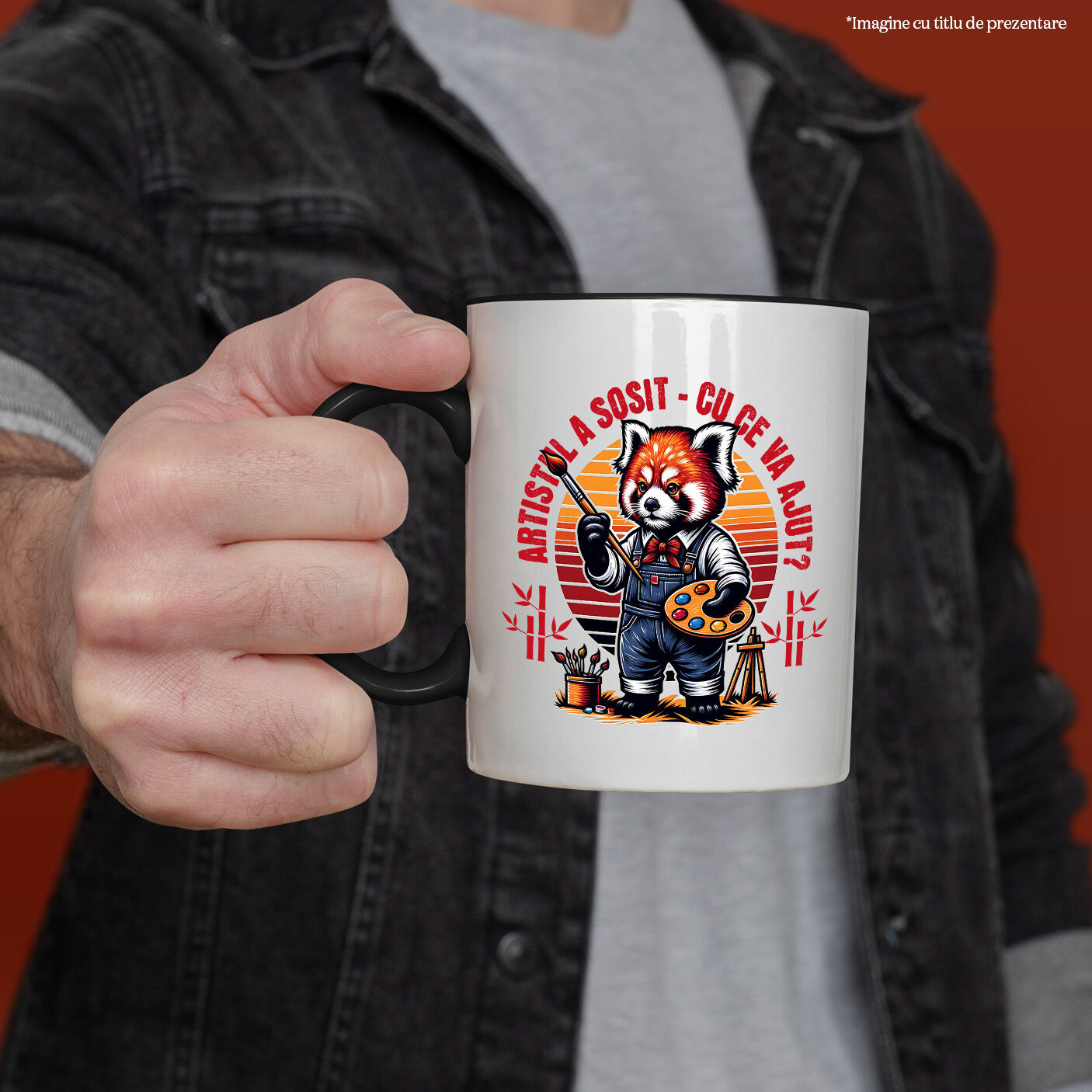 Cana Personalizata cu Vulpe Artista Pensula Pictura, Arta Pe Canvas, Papion Rosu, Ceramica, 330ML, cu Maner Negru