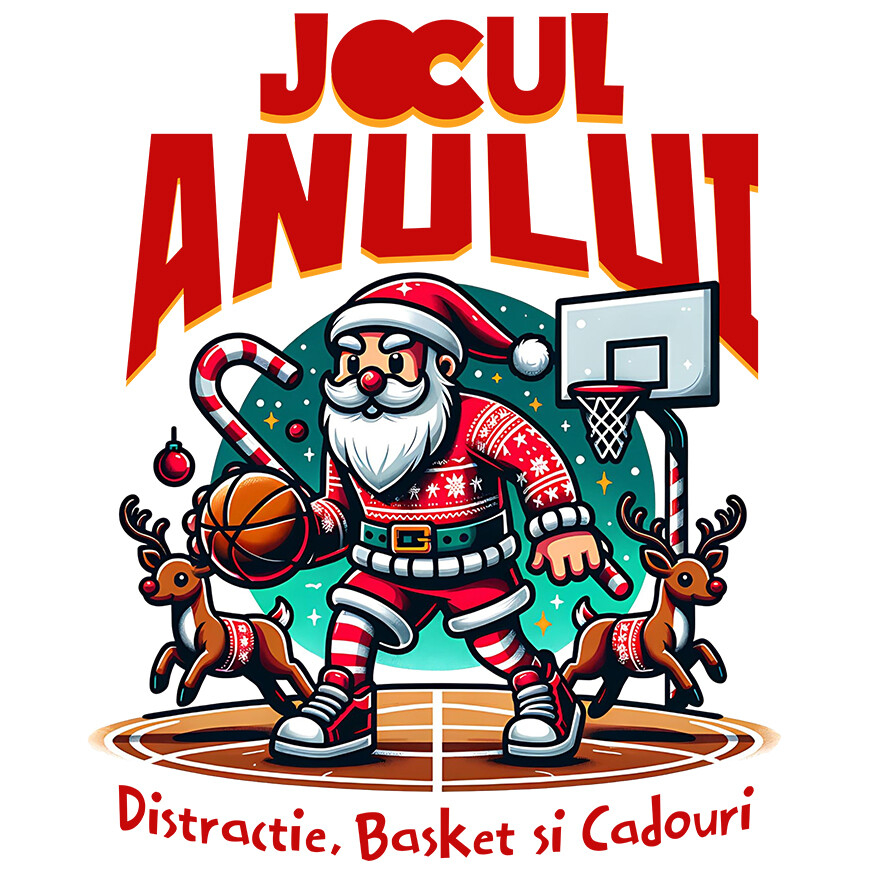 Sticker Personalizat cu Mos Craciun Pe Terenul De baschet Cu reni,Cadouri, Familie, Haios cu Margini Albe, PVC Vinyl 10 cm