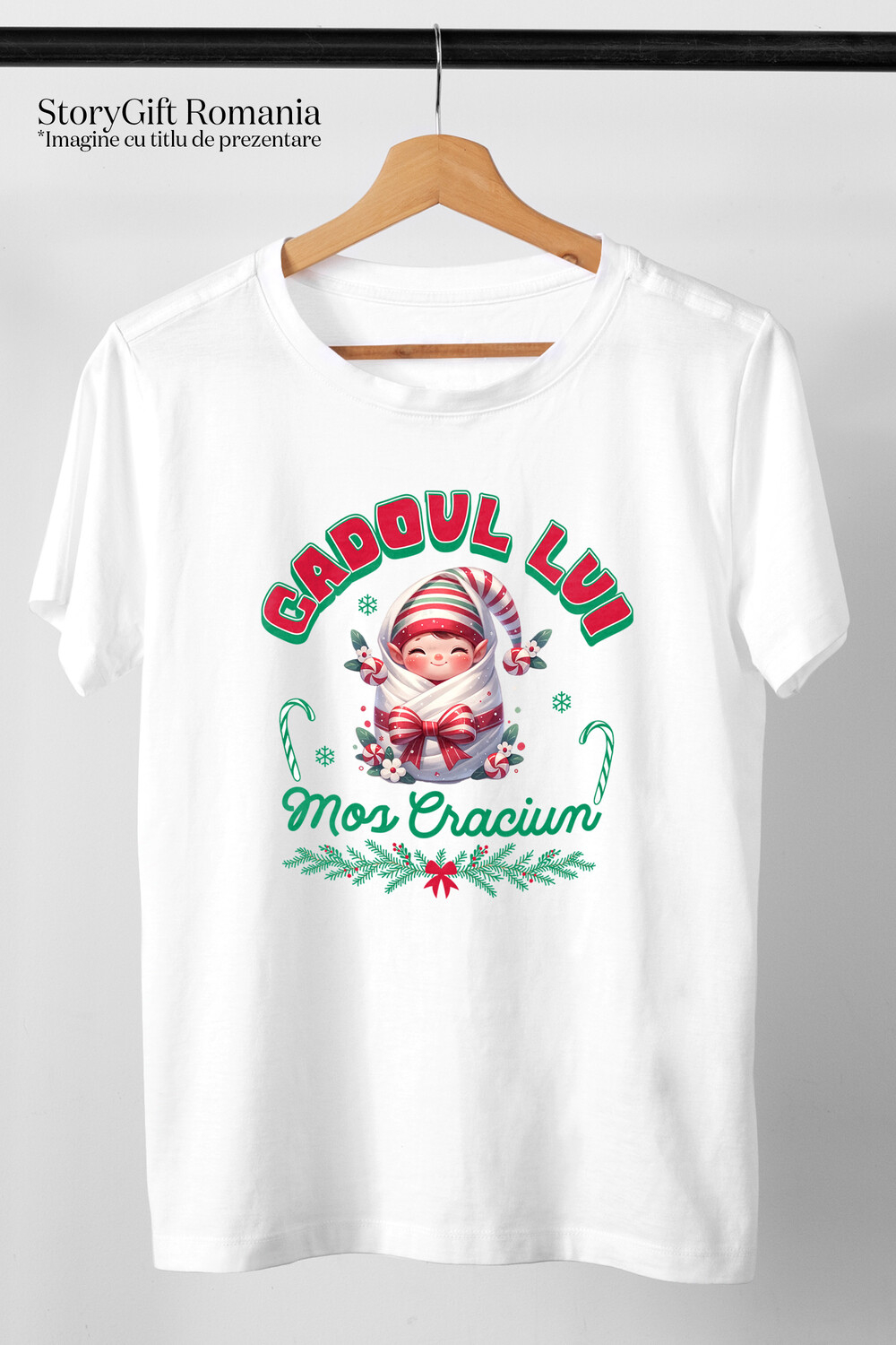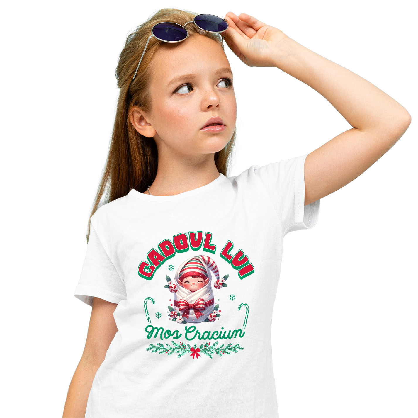 Tricou Copii cu Bebe in Paturica Cu Funda Rosie si Palarie, Cadoul De Mos Craciun cu imprimeu pe Fata, 100% Bumbac, Alb, 10 Ani
