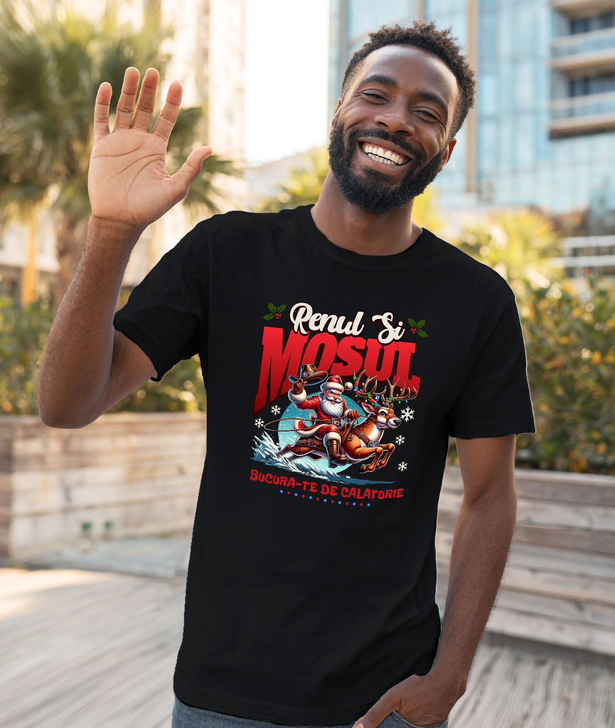 Tricou Barbati cu Mos Cracin Pe Ren Impodobit, Cadouri, Viteza, Mos Craciun Cool cu imprimeu pe Fata, 100% Bumbac, Negru, L