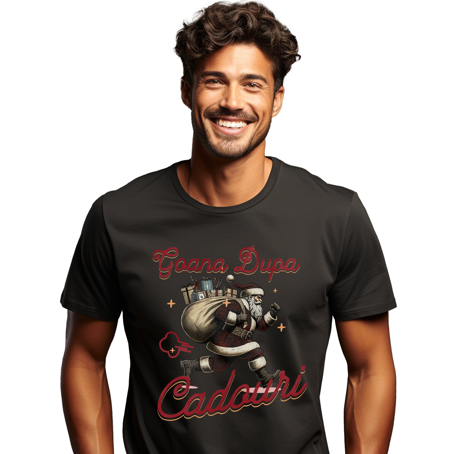 Tricou Barbati cu Mos Craciun Alergand cu Sac De Cadouri, Sarbatori, Familie, fericire cu imprimeu pe Fata, 100% Bumbac, Negru, L