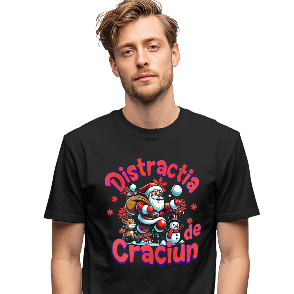 Tricou Barbati cu Mos Craciun Bataie Cu Bulgari Ren Om De Zapada, Distractia De Craciun cu imprimeu pe Fata, 100% Bumbac, Negru, L