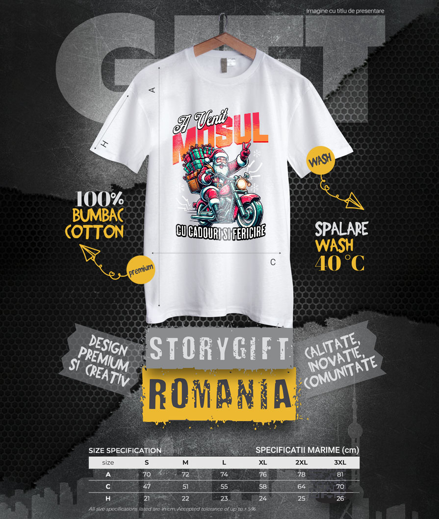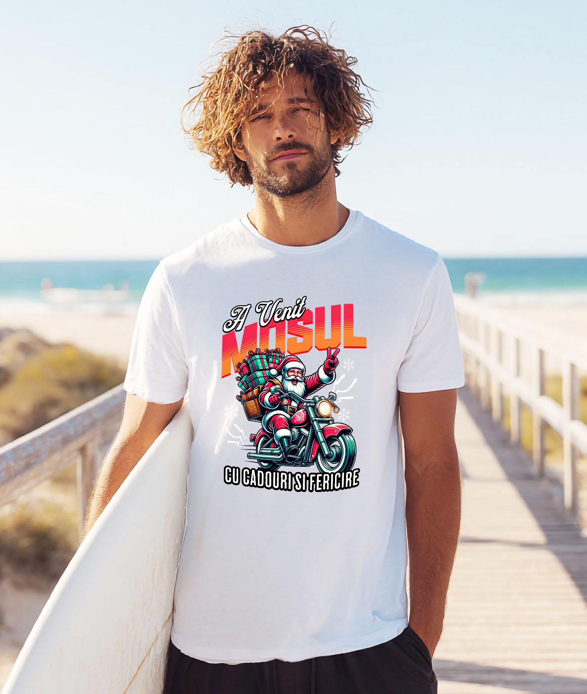 Tricou Barbati cu Mos Craciun Cool Pe Motocicleta, Cadouri Si Fericire, Sarbatori, Iubitorii De Viteza cu imprimeu pe Fata, 100% Bumbac, Alb, M