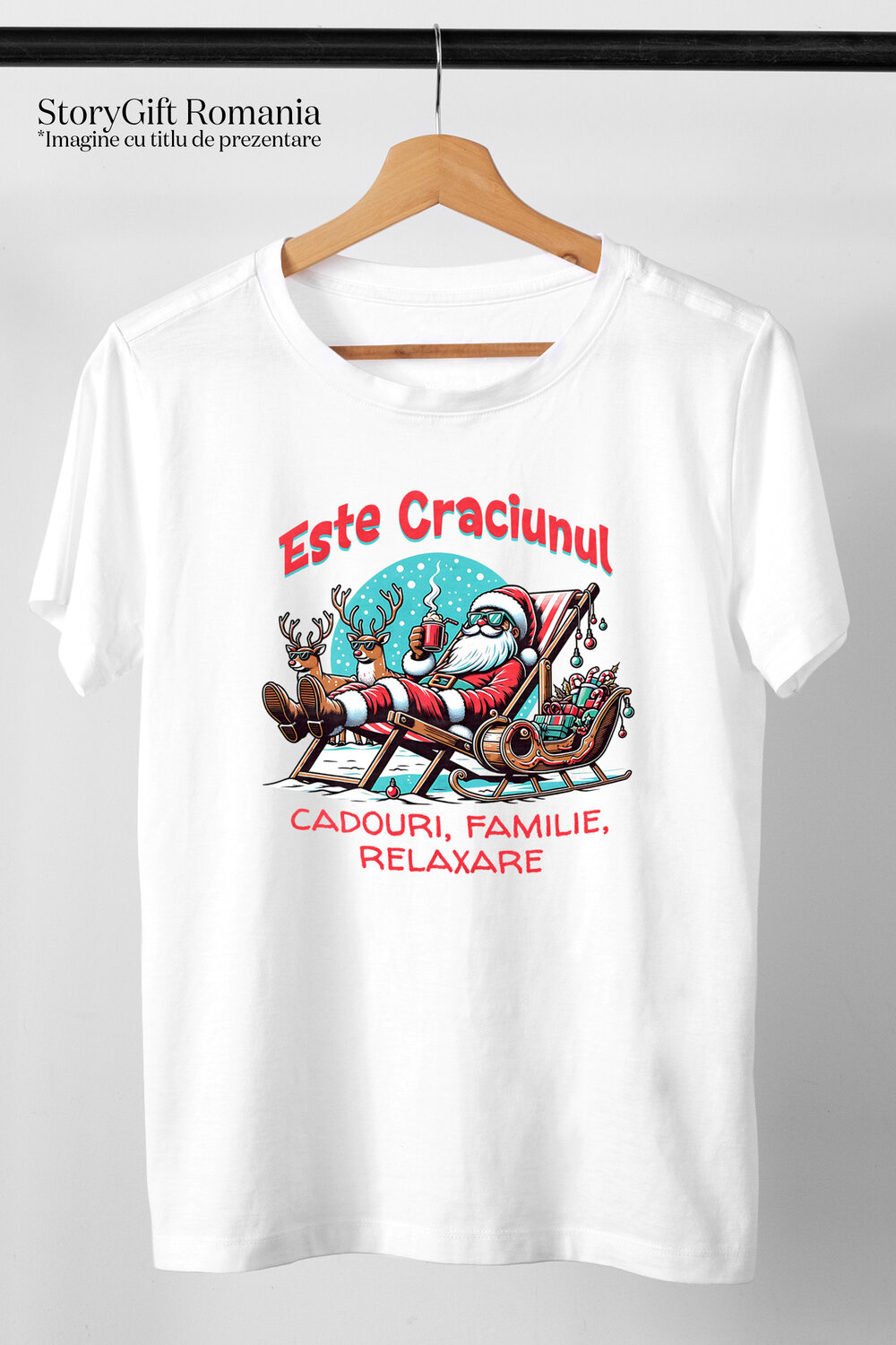 Tricou Barbati cu Mos Craciun Vesel pe Sezlong Cu Ciocolata calda, Cadouri Relaxare, cu imprimeu pe Fata, 100% Bumbac, Alb, S