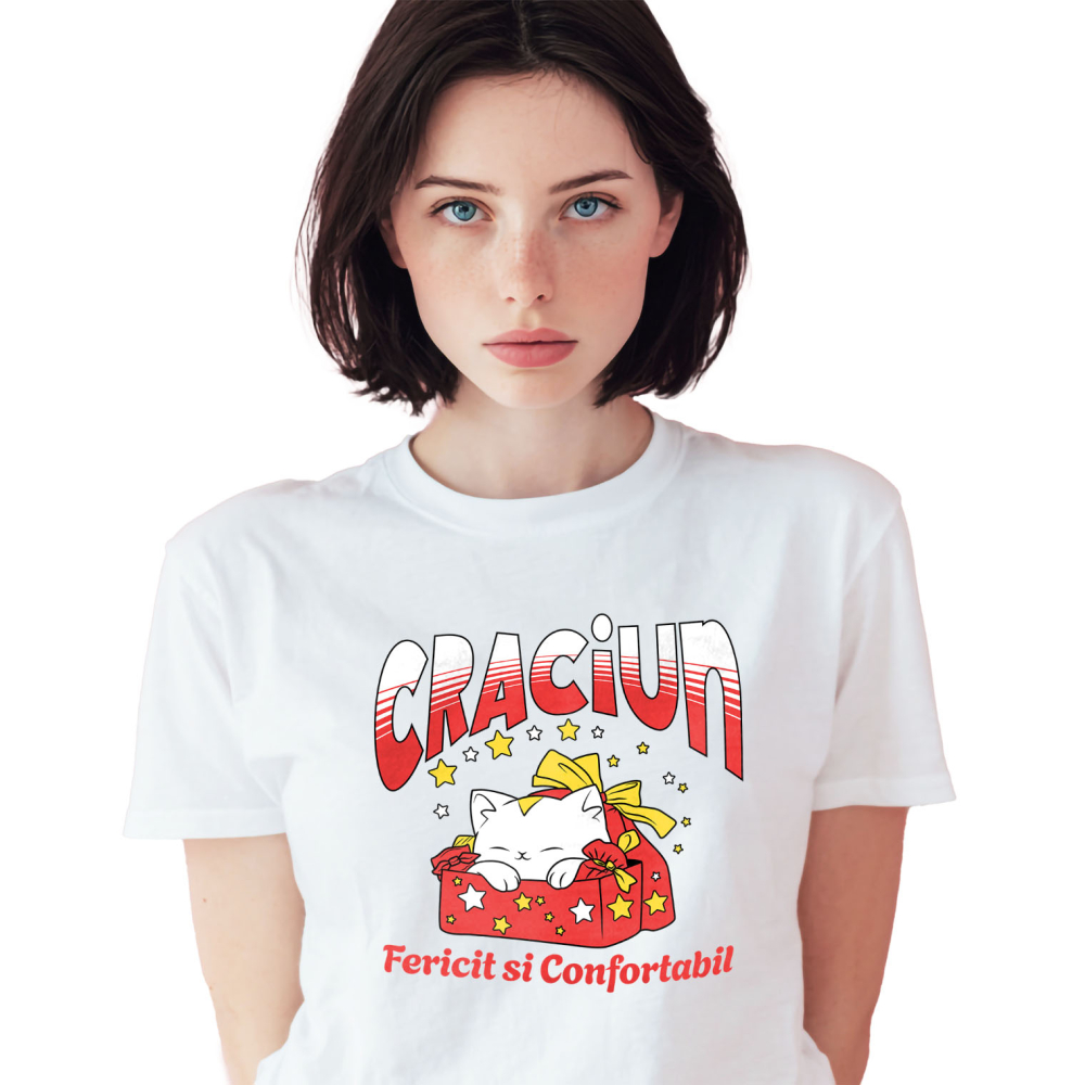Tricou Femei cu Pisica Alba In Cutie De Cadou Rosie, Sac Cu Funda, Craciun, Familie cu imprimeu pe Fata, 100% Bumbac, Alb, L
