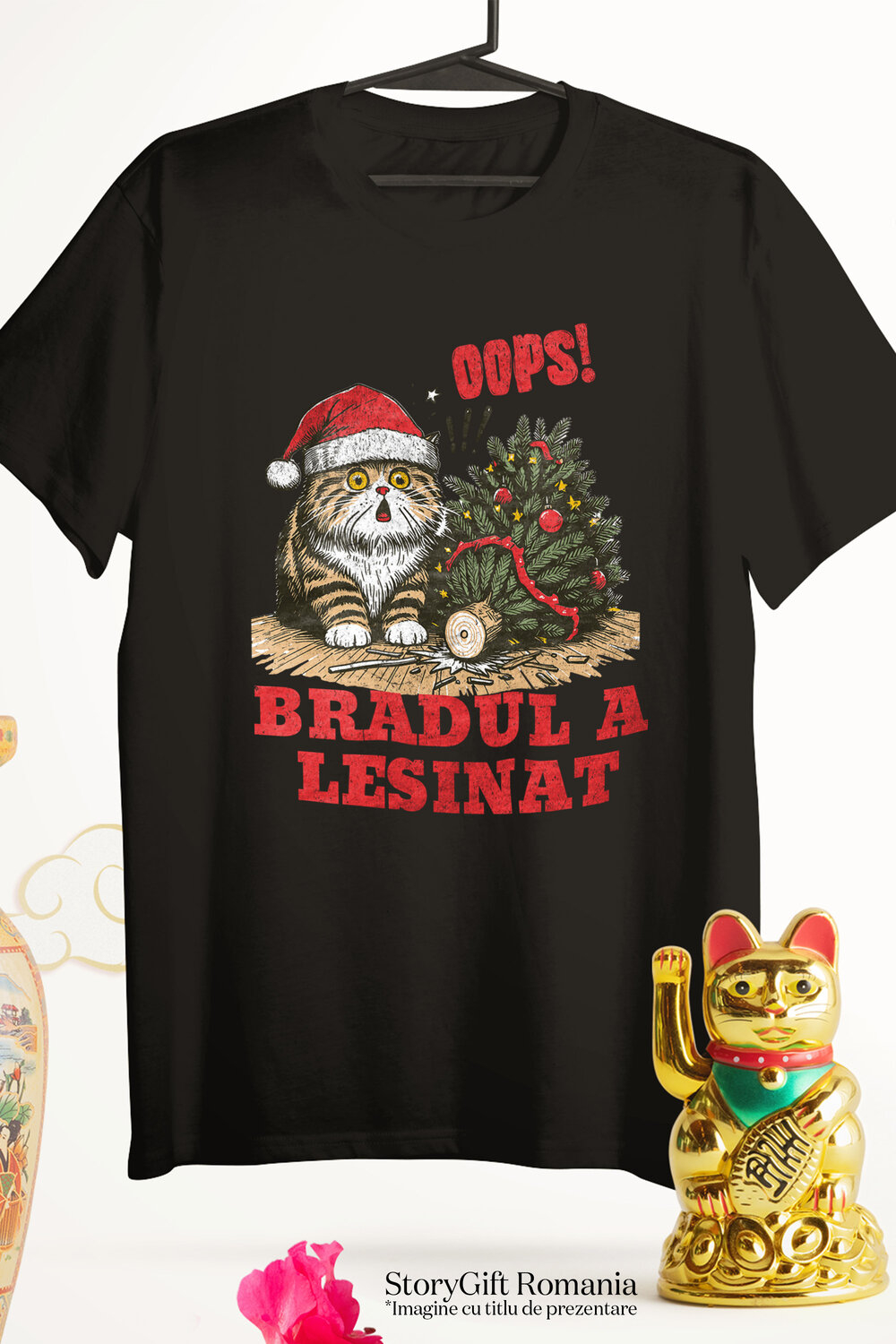 Tricou Barbati cu Pisica Grasa Cu Caciula Mos craciun, Bradul Cazut, Daramat, Animale Pufoase cu imprimeu pe Fata, 100% Bumbac, Negru, L