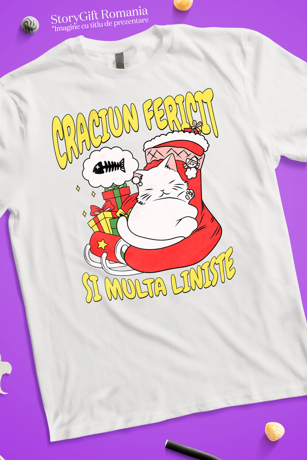 Tricou Femei cu Pisica Grasa Viseaza La Peste, Animal Pufos De Craciun Craciun Fericit Si Multe Liniste cu imprimeu pe Fata, 100% Bumbac, Alb, S