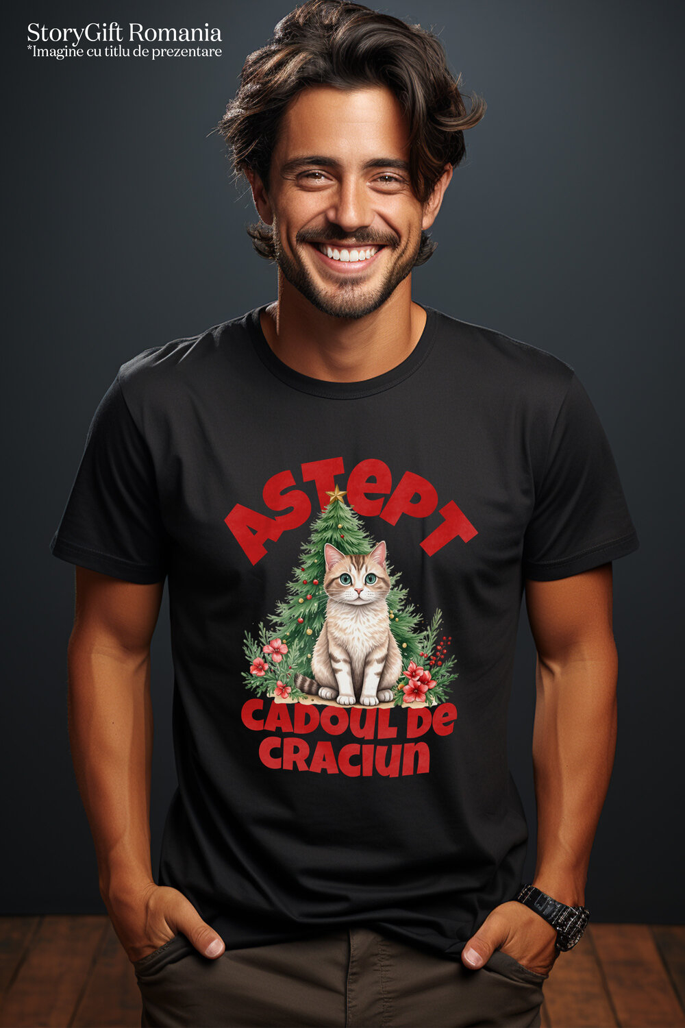 Tricou Barbati cu Pisica Pufoasa Langa Bradul De Craciun, Iubitorii De Animale, Sarbatori cu imprimeu pe Fata, 100% Bumbac, Negru, L