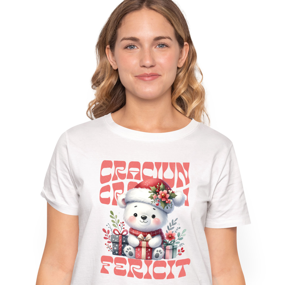 Tricou Femei cu Urs Alb Cu Fular Si Caciula Mos Craciun Cadouri Colorate cu imprimeu pe Fata, 100% Bumbac, Alb, M