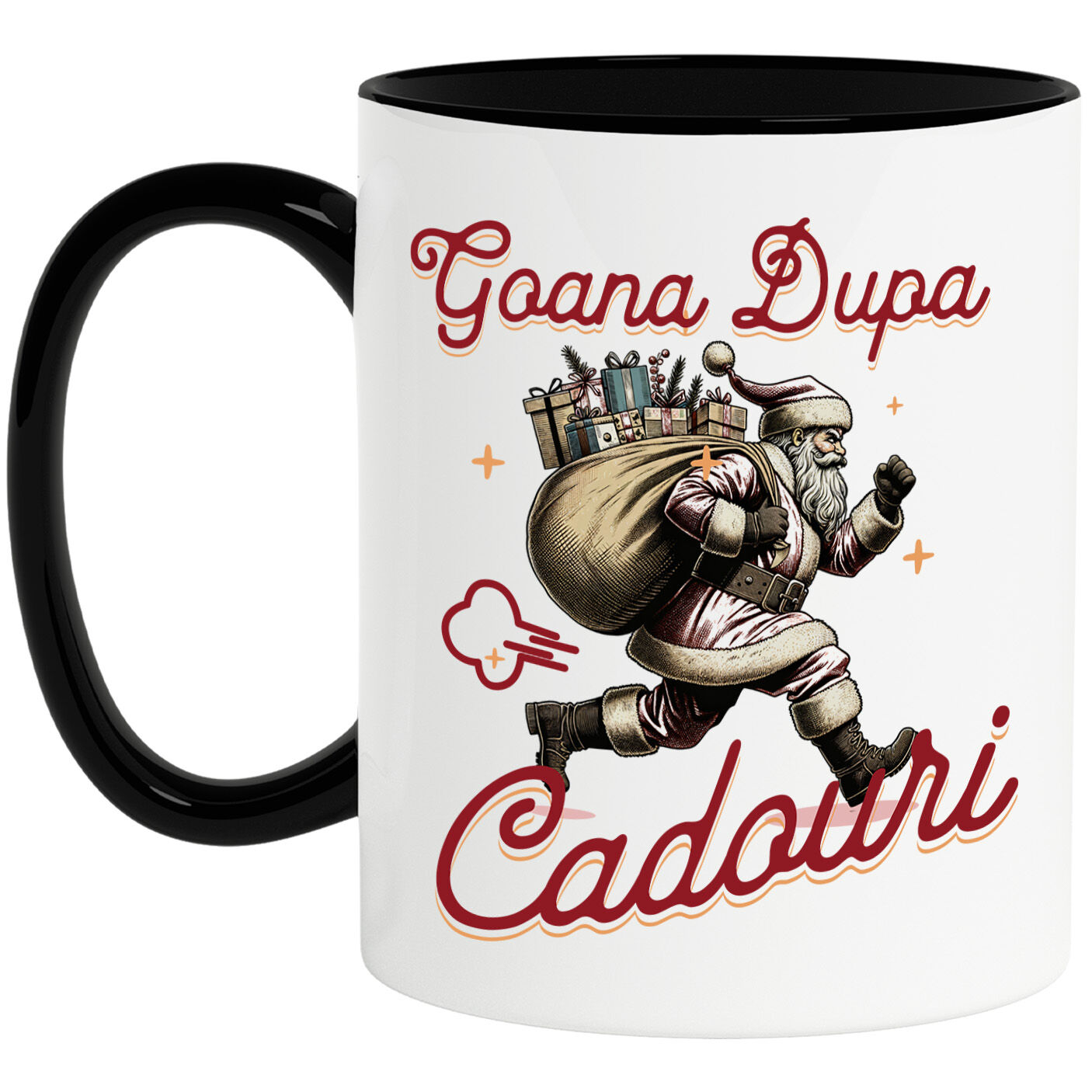 Cana Personalizata cu Mos Craciun Alergand cu Sac De Cadouri, Sarbatori, Familie, fericire, Ceramica, 330ML, cu Maner Negru