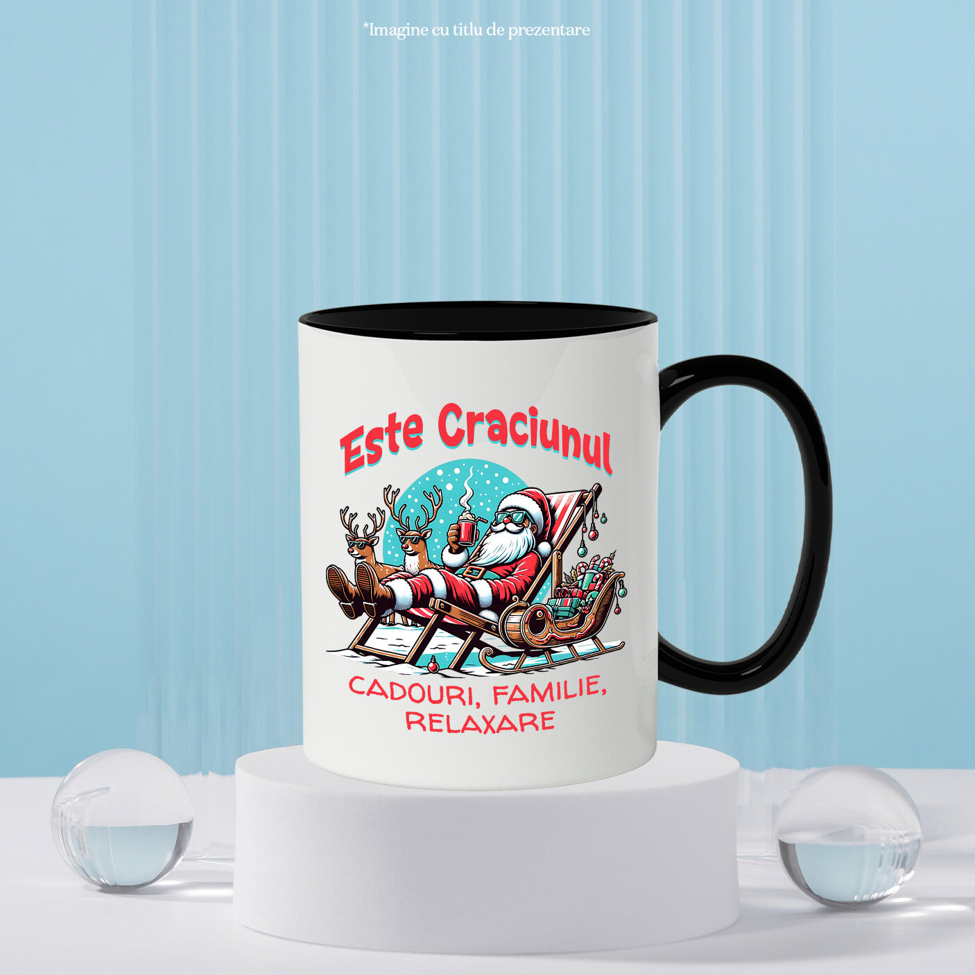 Cana Personalizata cu Mos Craciun Vesel pe Sezlong Cu Ciocolata calda, Cadouri Relaxare, , Ceramica, 330ML, cu Maner Negru