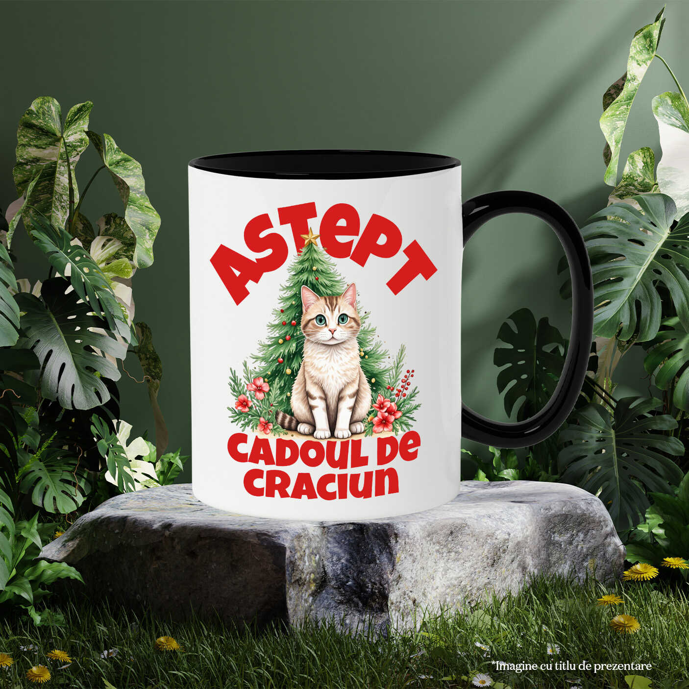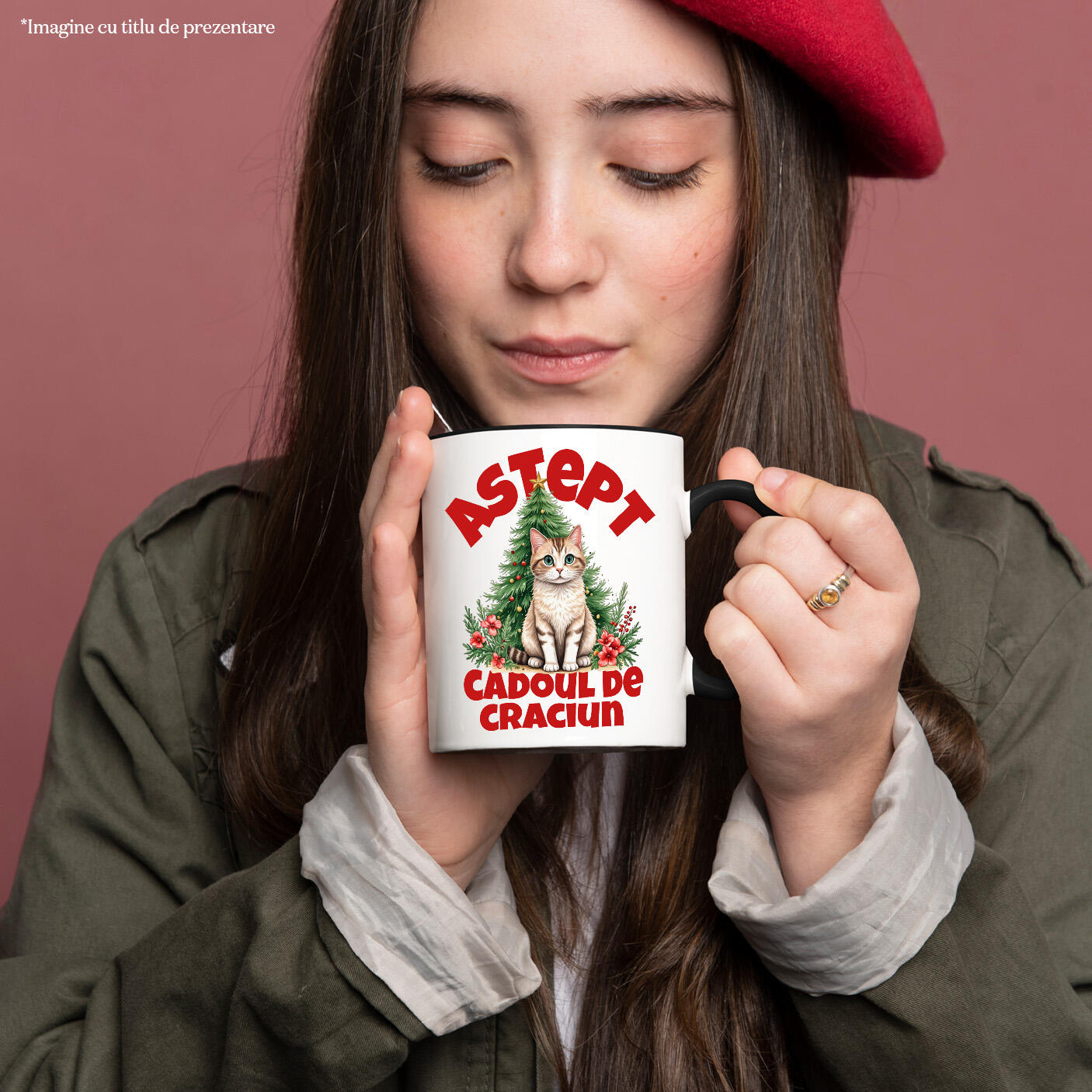 Cana Personalizata cu Pisica Pufoasa Langa Bradul De Craciun, Iubitorii De Animale, Sarbatori, Ceramica, 330ML, cu Maner Negru