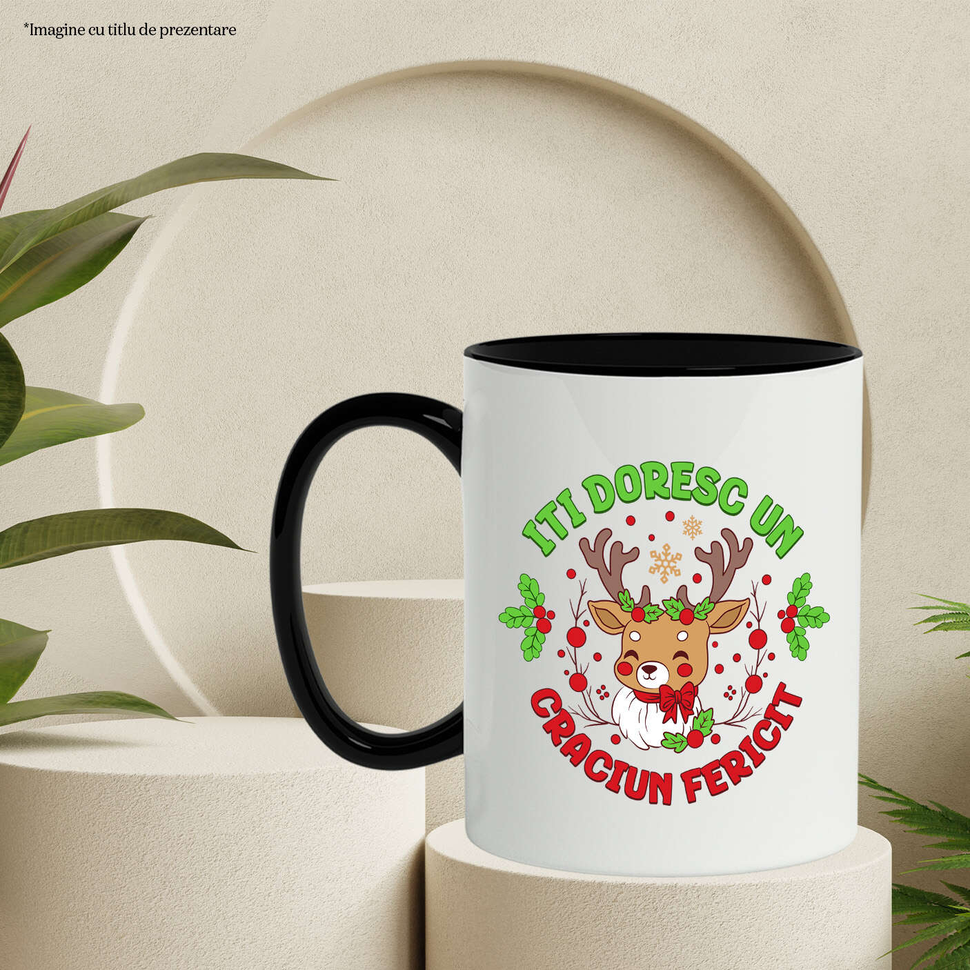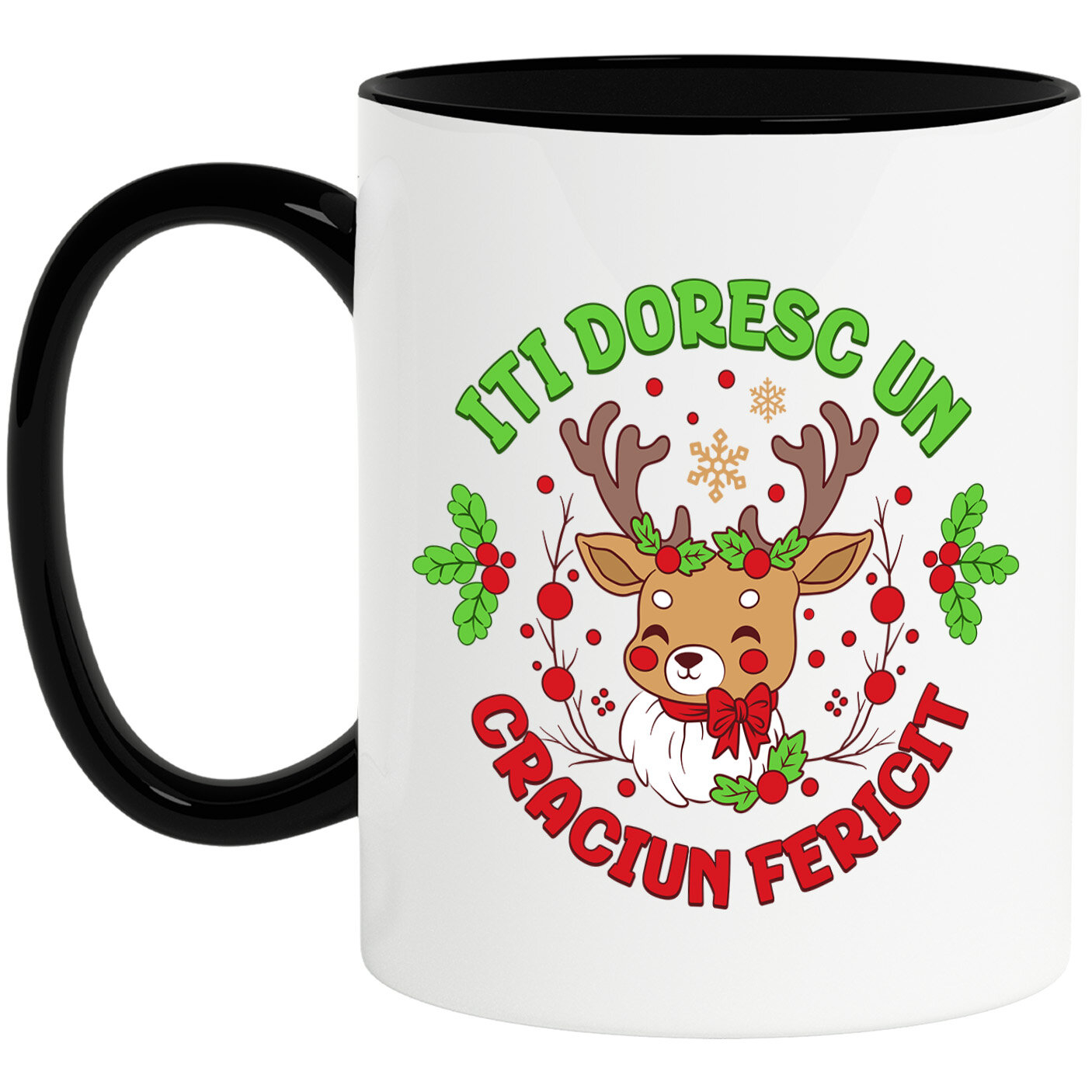 Cana Personalizata cu Ren Cu Coarne Lungi Impodobite, Craciun, Globuri, Vasc, Cadouri, Ceramica, 330ML, cu Maner Negru
