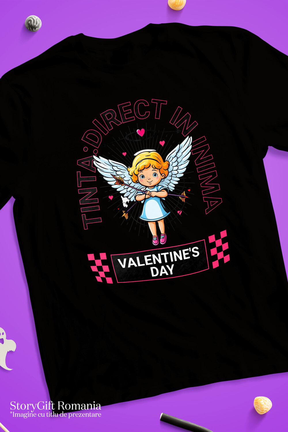 Tricou Femei cu Fata Inger Cu Aripi Albe Si Sageti,Tinta In Inima Valentine's Day, Dragoste cu imprimeu pe Fata, 100% Bumbac, Negru, L