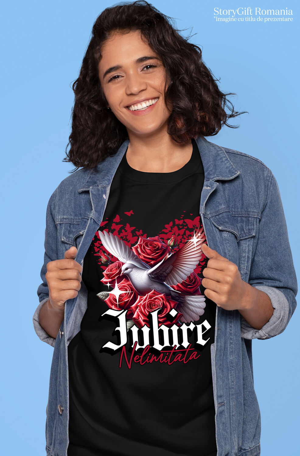 Tricou Femei cu porumbel Alb Trandafiri Rosii, Iubire, Valentine's Day, Puritate, cu imprimeu pe Fata, 100% Bumbac, Negru, L