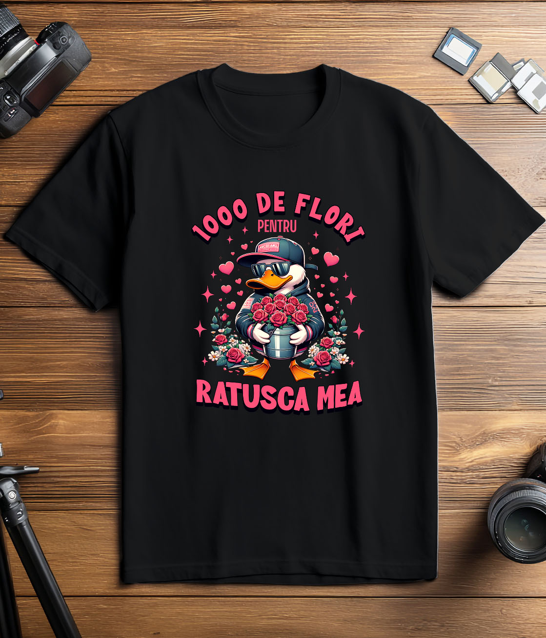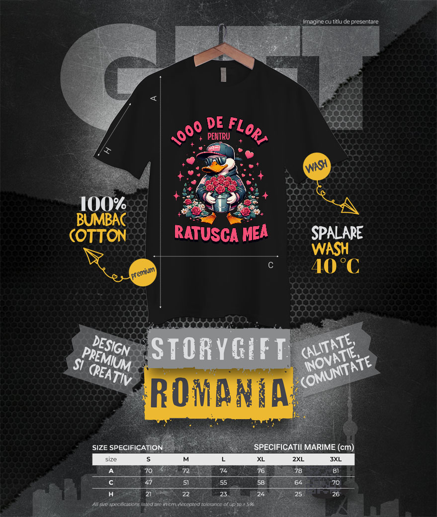 Tricou Barbati cu Ratusca Alba Cu Buchet de Trandfiri, Romantic, Cadou Valentine's Day cu imprimeu pe Fata, 100% Bumbac, Negru, L