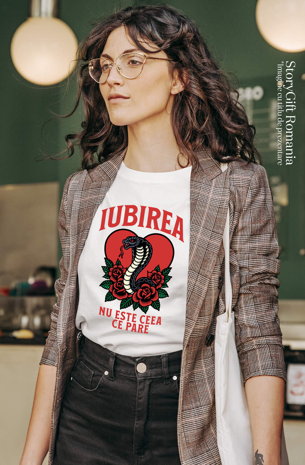 Tricou Femei cu Sarpe Printre Flori Rosi, Inima Franta, Iubire falsa, Animal Otravitor cu imprimeu pe Fata, 100% Bumbac, Alb, M