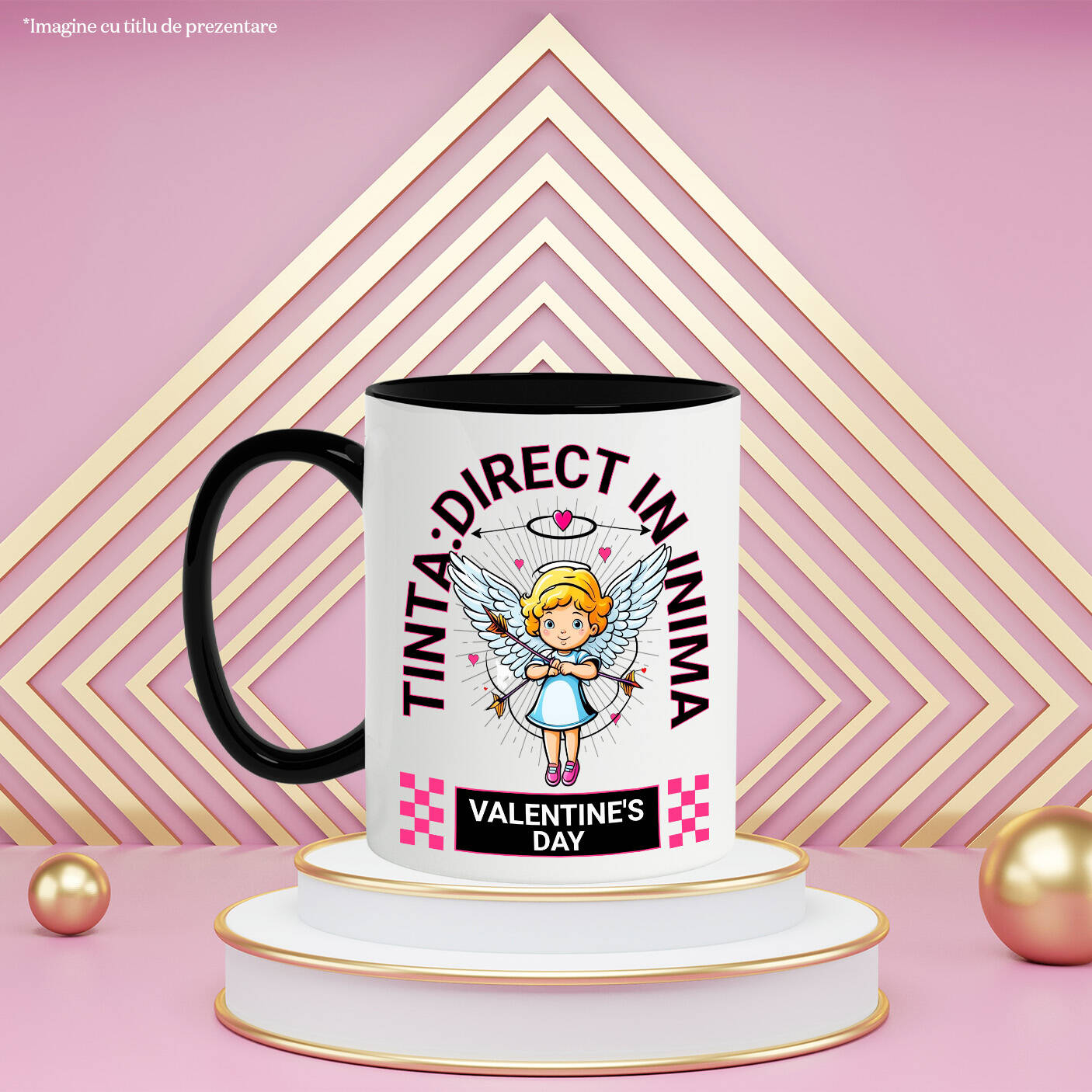 Cana Personalizata cu Fata Inger Cu Aripi Albe Si Sageti,Tinta In Inima Valentine's Day, Dragoste, Ceramica, 330ML, cu Maner Negru